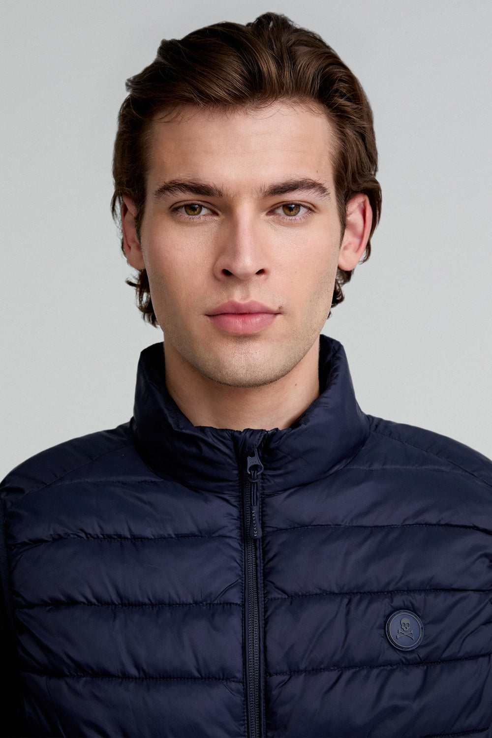 - Coupe slim, col montant et fermeture éclair à double curseur.
