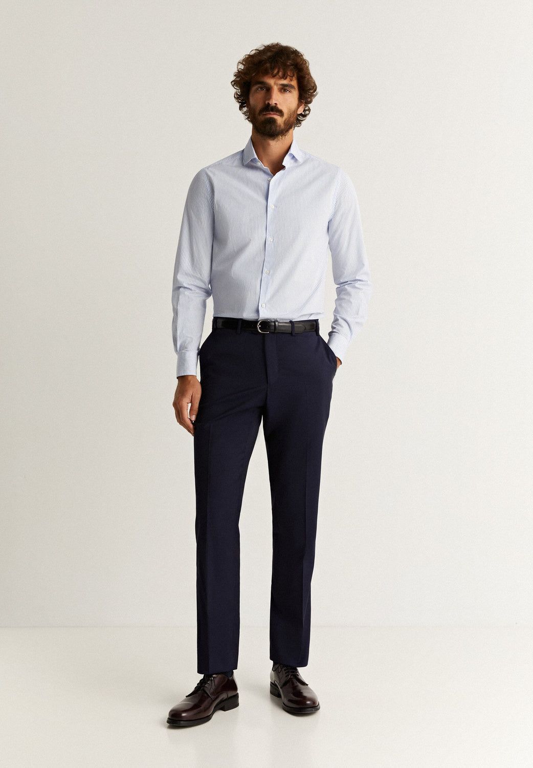 Chemise habillée confectionnée en 100 % coton. Coupe slim, col italien et fermeture boutonnée. Manches longues et poignets boutonnés.
