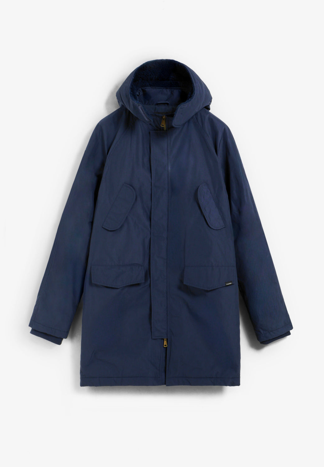 Waterproof parka with hood. Front zip fastening. Long sleeves. Padded garment with quilting. Four front pockets, two slanted flap pockets and two straight lower pockets. Thermolite filling. Fleece detail on the hood. Velcro neck fastening. Rubber logo patch detail on the pocket and skull print on the sleeve.