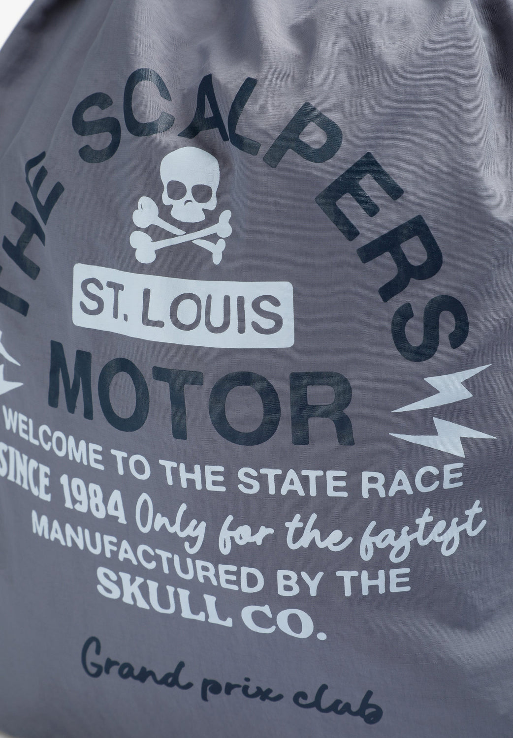 Lightweight synthetic bag. Handle. Double handle on back. Front logo print.