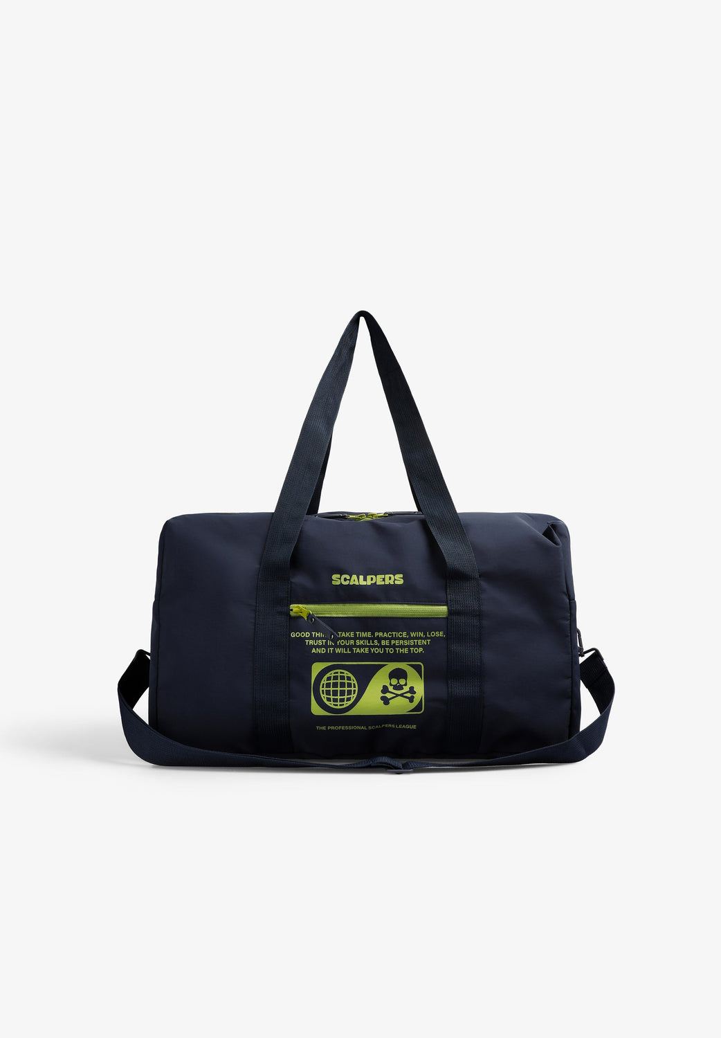 Bag made of a technical fabric. Main and side compartments with zip closure. Zip fastening, short handles and long detachable strap. Front logo and skull print.