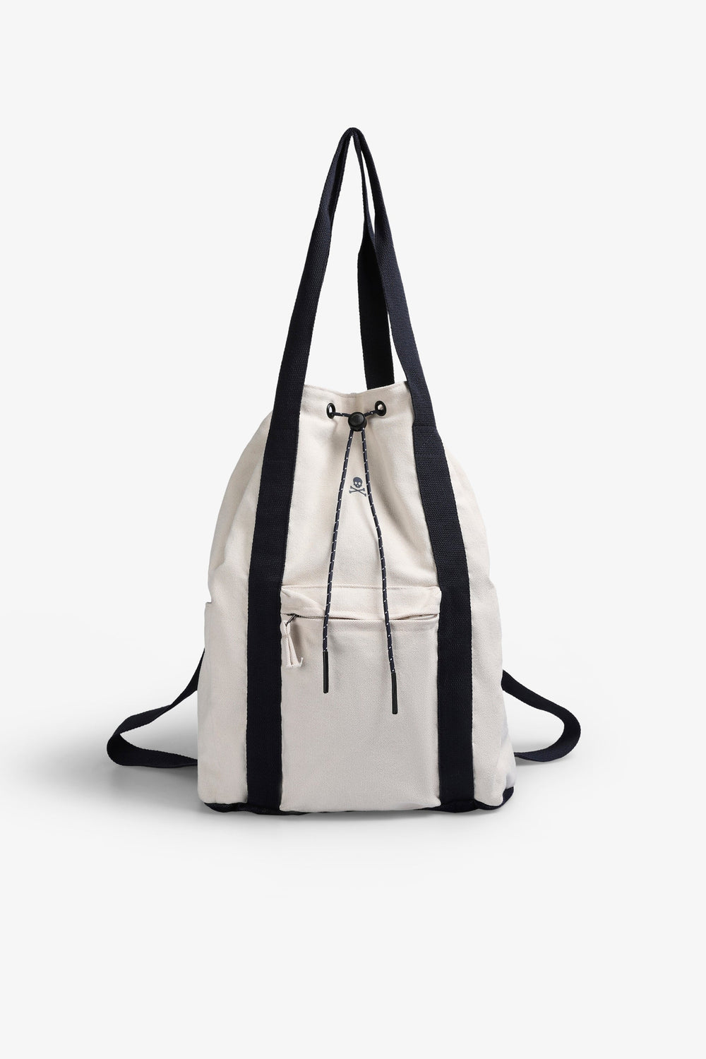 Backpack made of 100% cotton. Lined. Front pocket with zip fastening. Two side compartments. Shoulder straps. Embroidered logo detail on the front. Main fastening with adjustable cords.