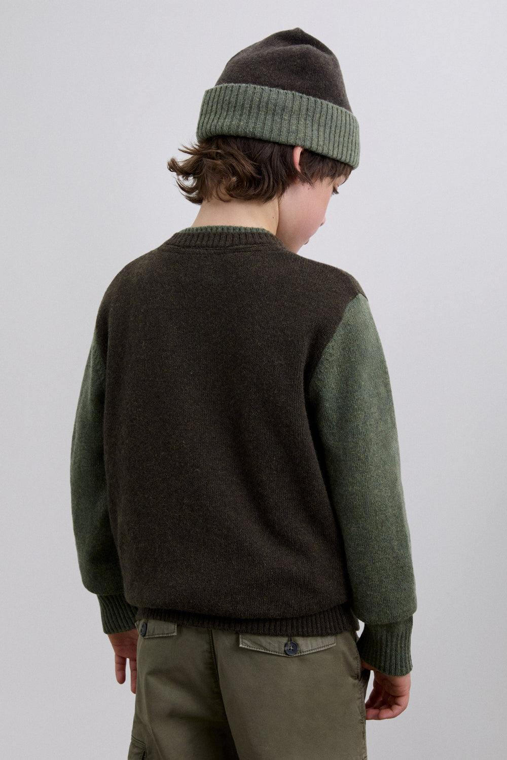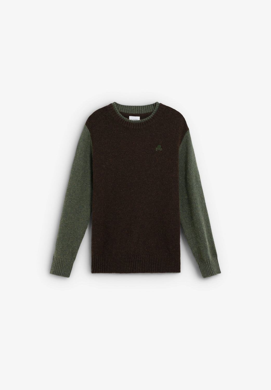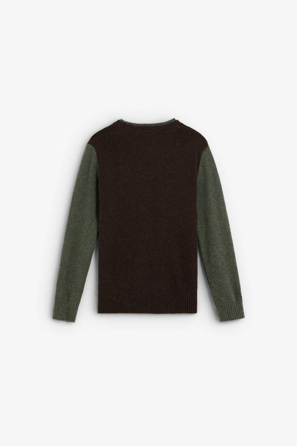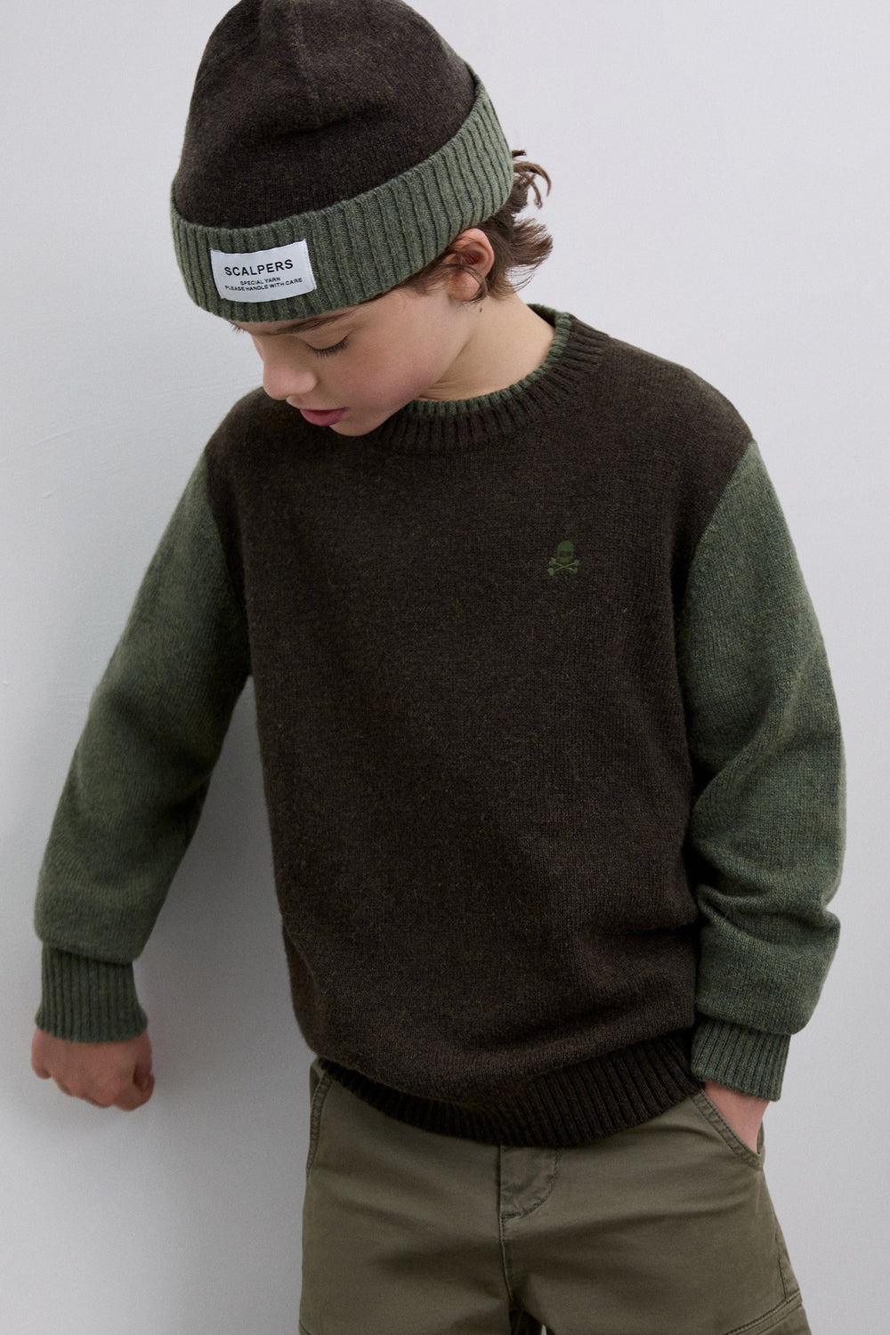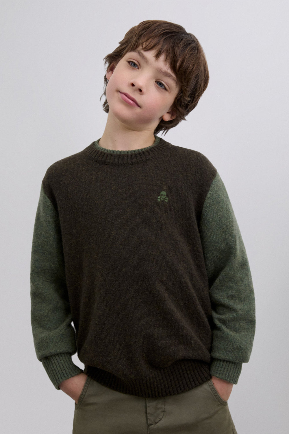 Knit sweater. Round neck and contrasting long sleeves. Contrast embroidered logo detail on the chest.