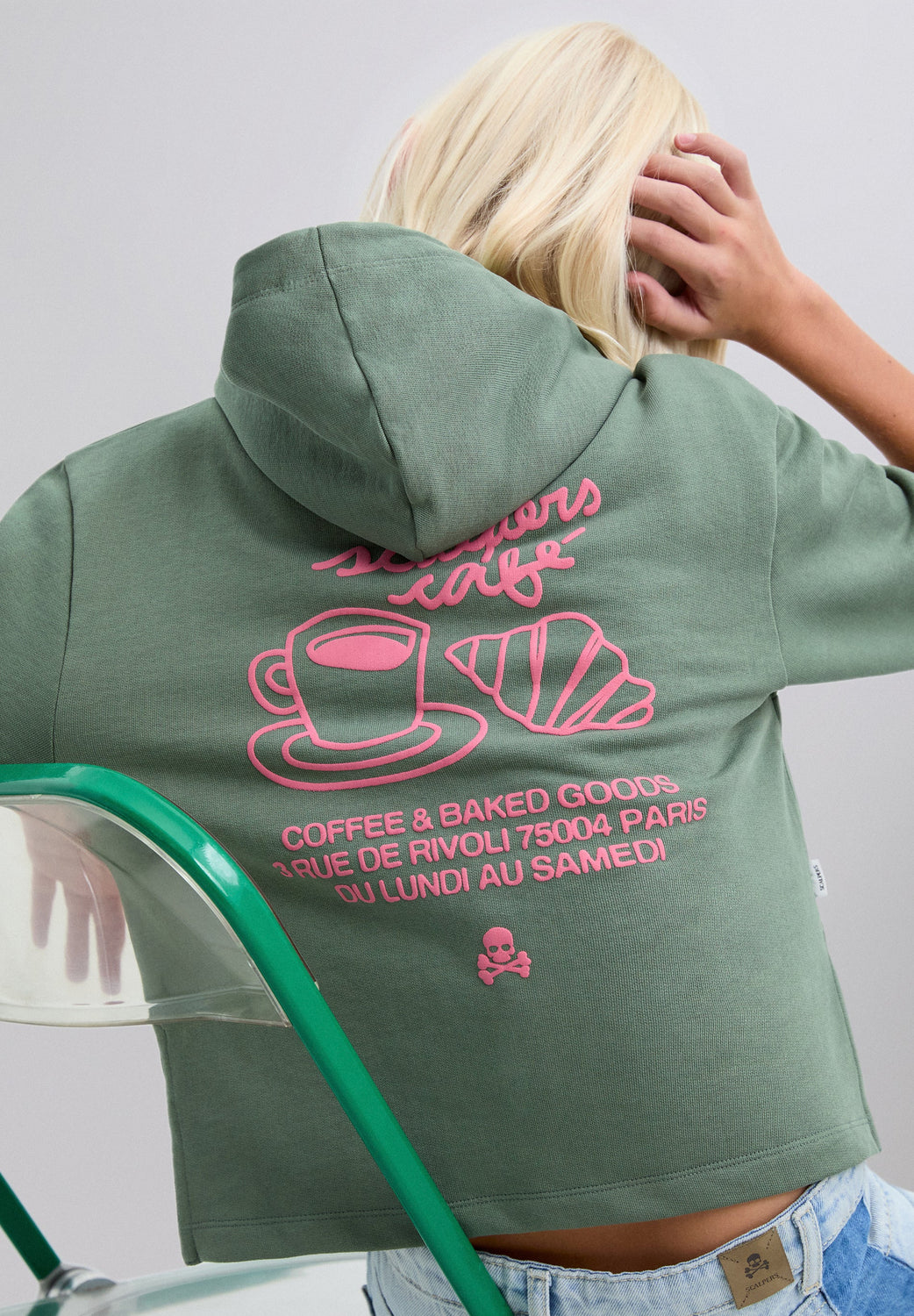 Sweatshirt with adjustable hood made of 100% BCI cotton. Long sleeves with cuffs and front pouch pockets. Print detail on the chest and back.