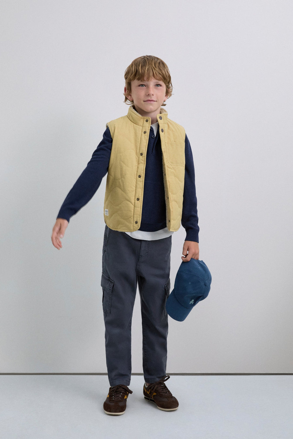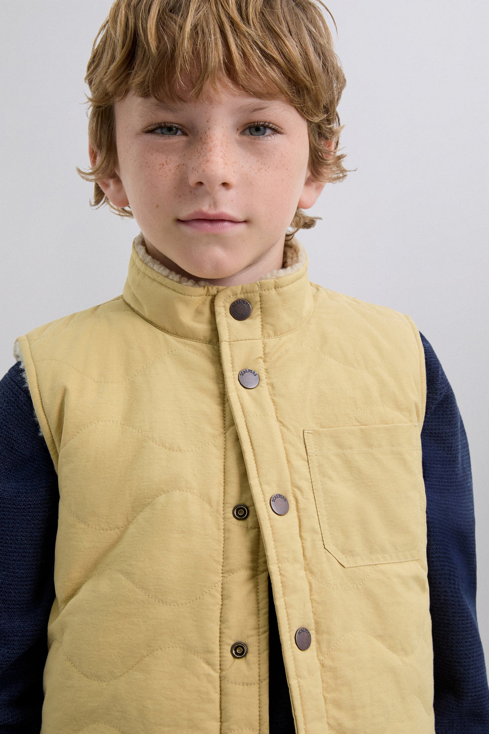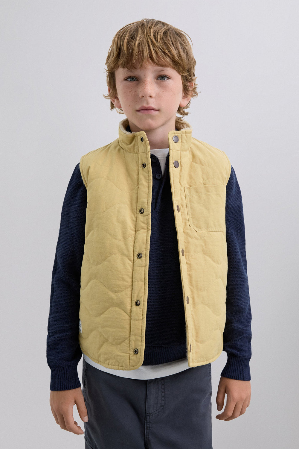 Sleeveless puffer jacket with outside pocket. Faux shealing lining. High collar. Regular fit. Button fastening.
