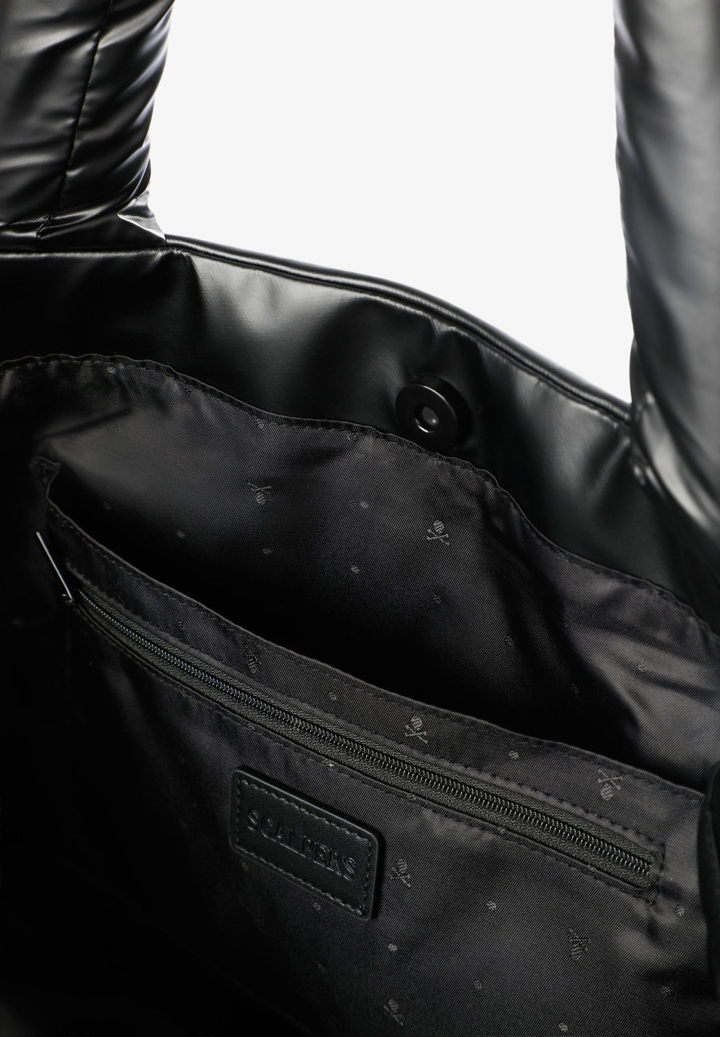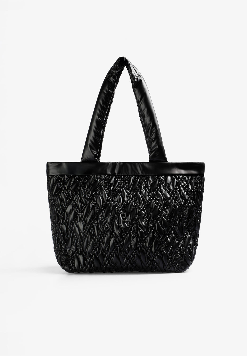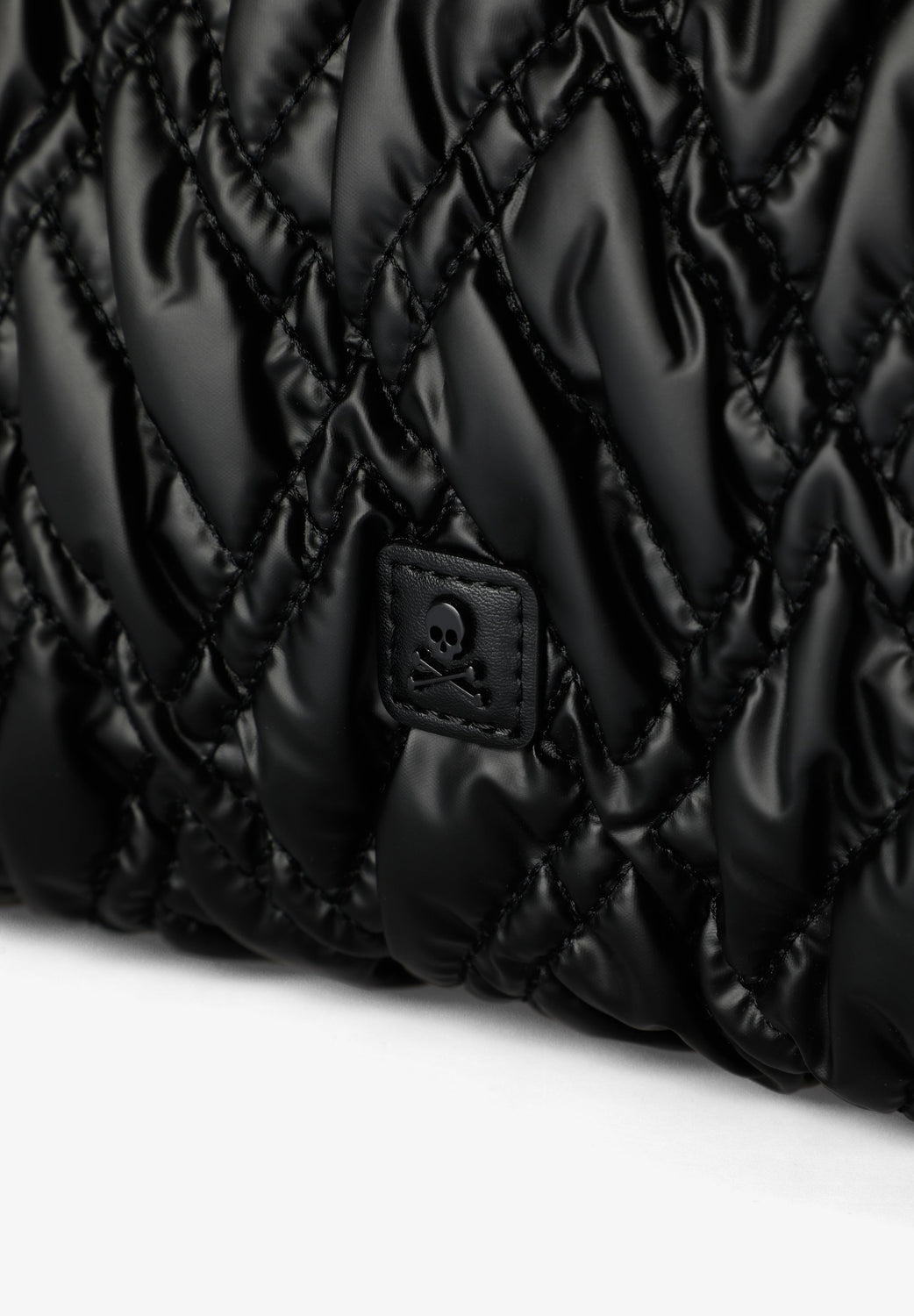 Quilted tote bag. Double strap. Magnetic button closure. Lining and inside pocket with zip closure. Logo detail on pocket and rubberised patch with metallic skull on front.
