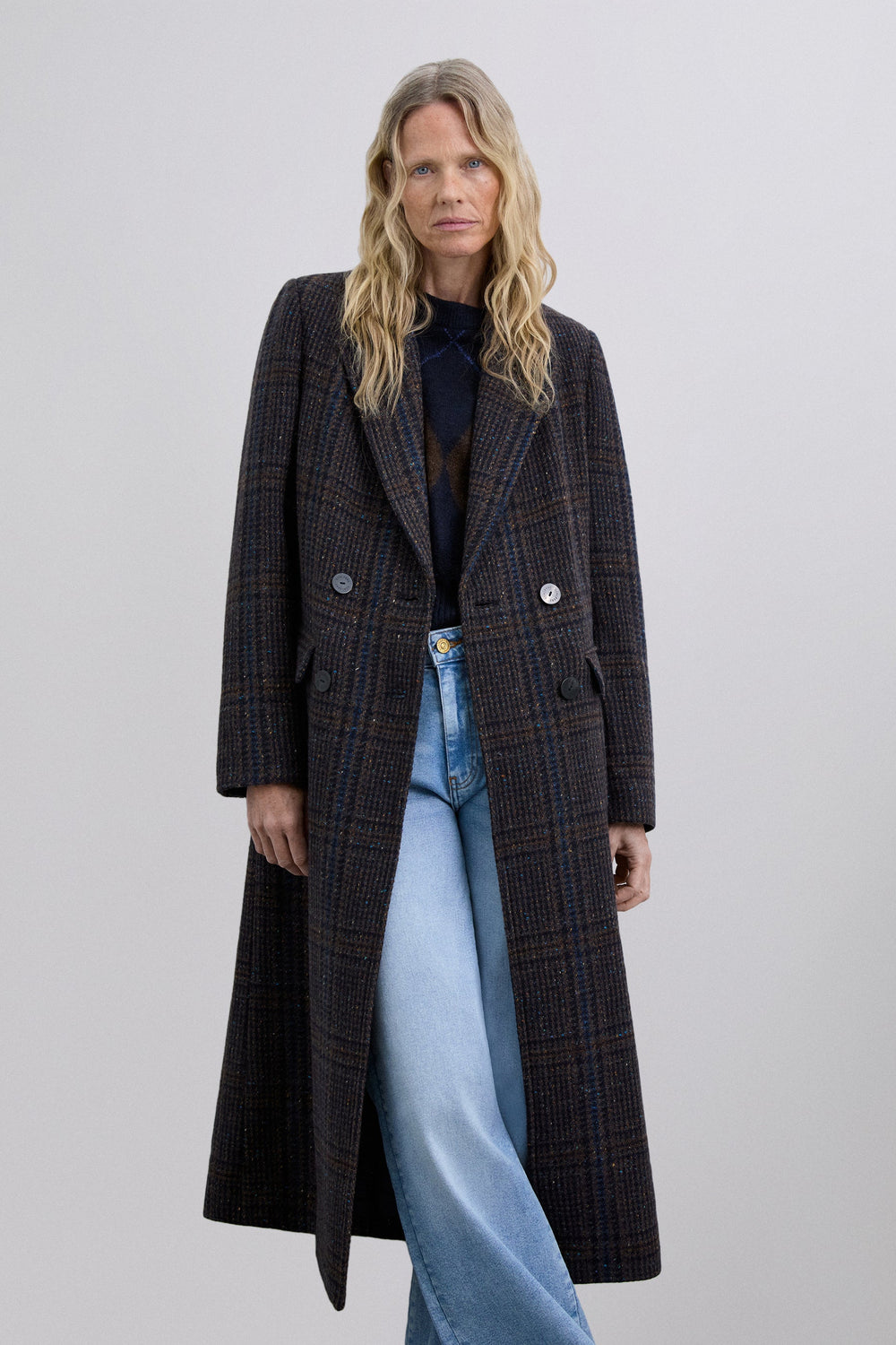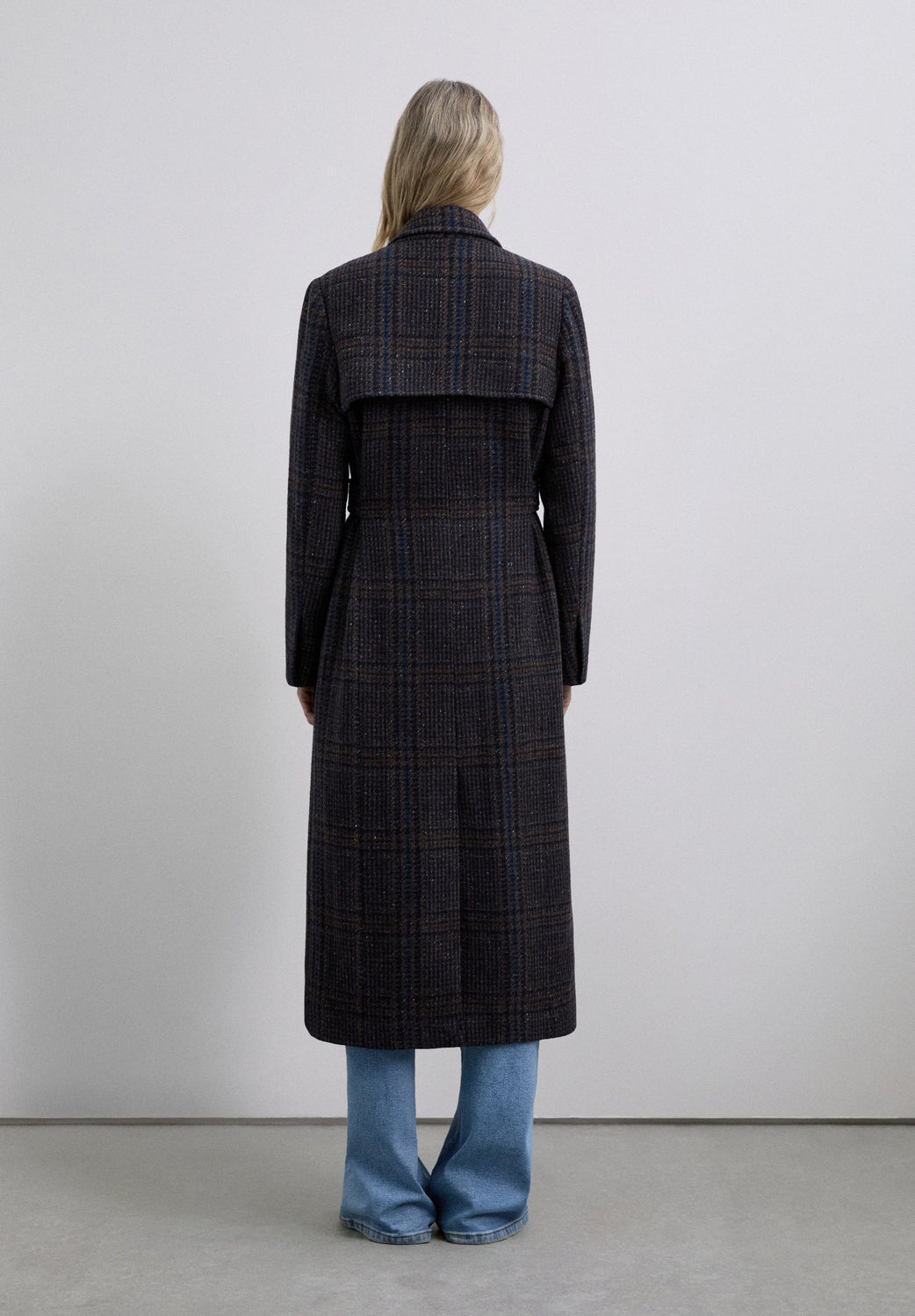 Long wool coat with subtle check pattern. Features shoulder pads, straight cut and classic lapels. Front button fastening and matching belt to adjust the waist. Side pockets.