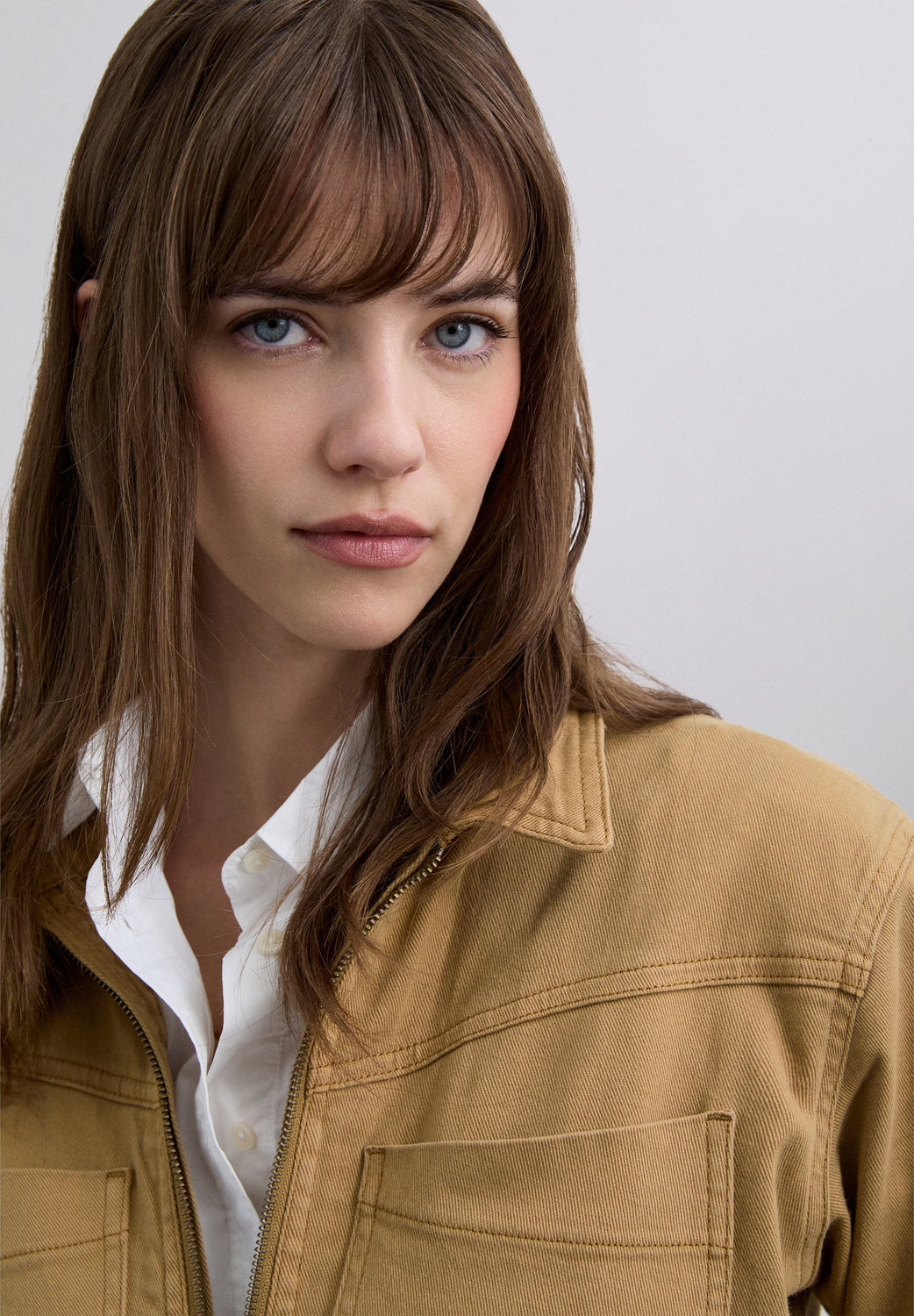 Made of cotton fabric Long sleeve jumpsuit with shirt collar. Front zip fastening. Patch pockets on front and back. Straight leg.