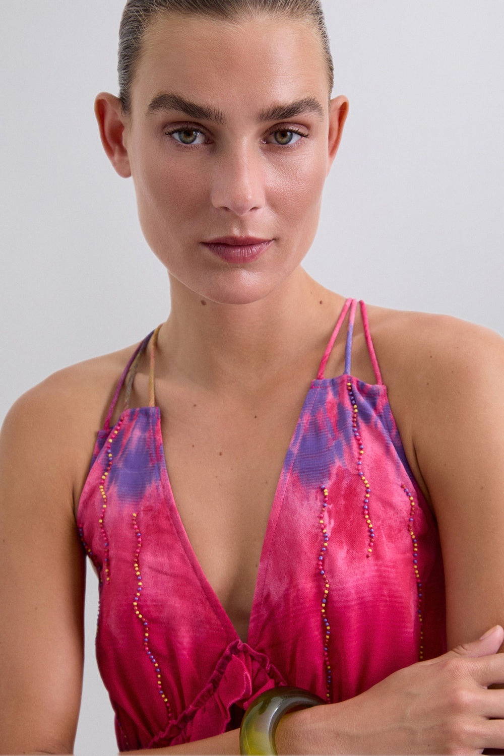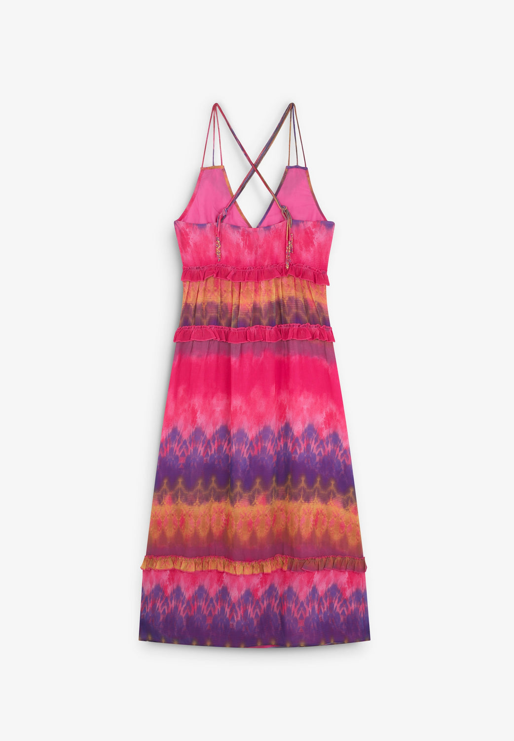 Long dress made of flowing fabric. V-neck with tie-dye print and ruffle details. Hanging ribbons with coloured beads on collar and waist.