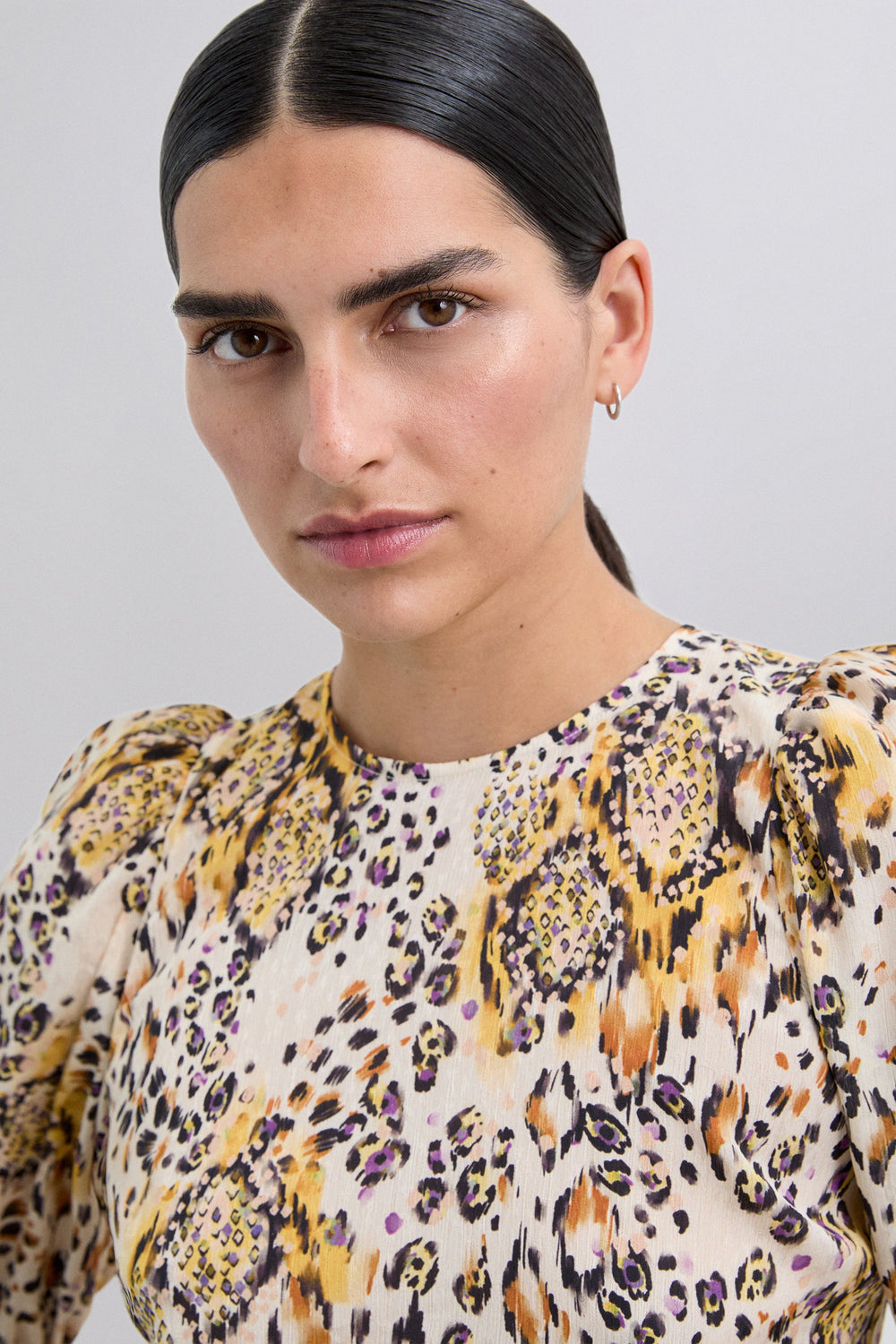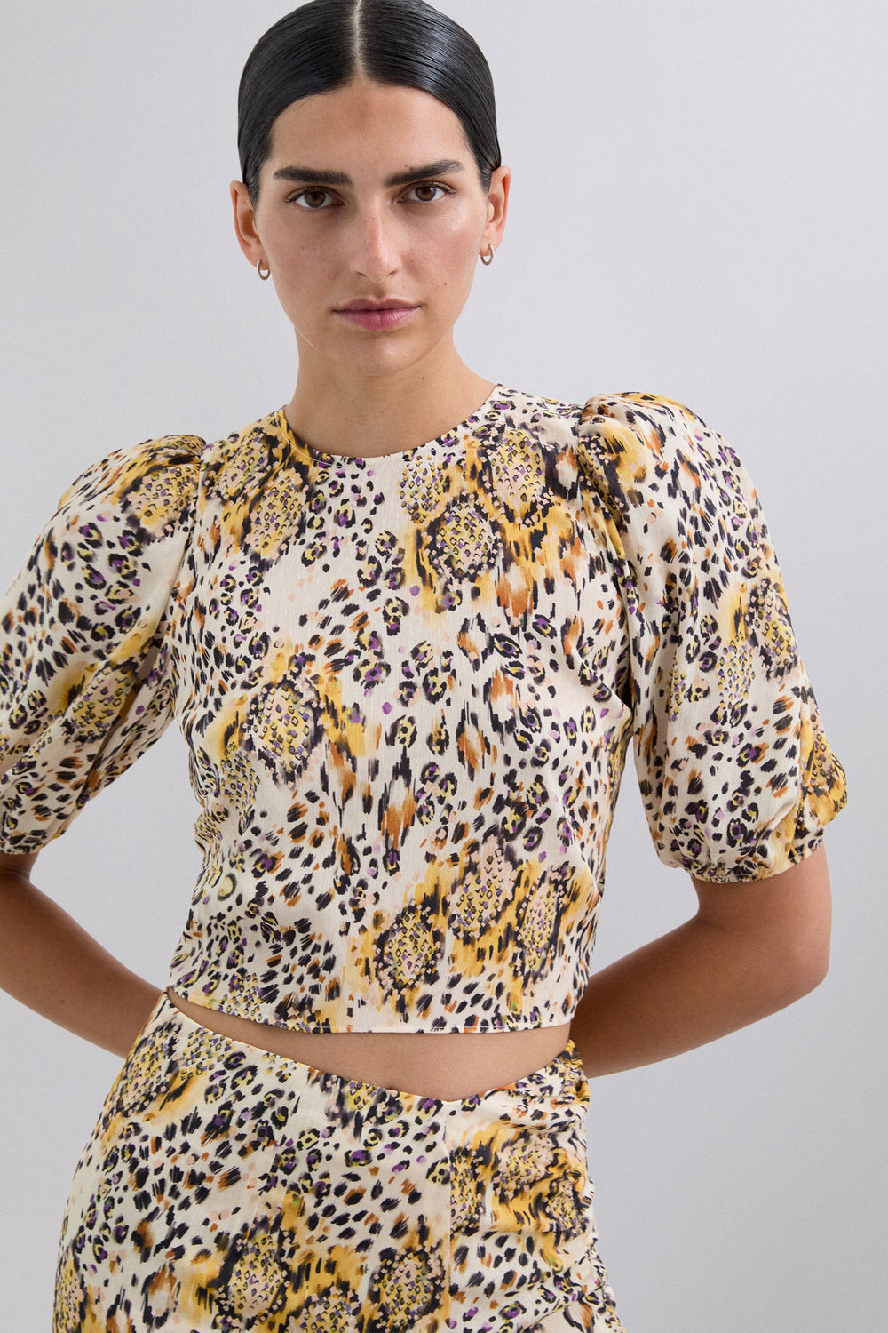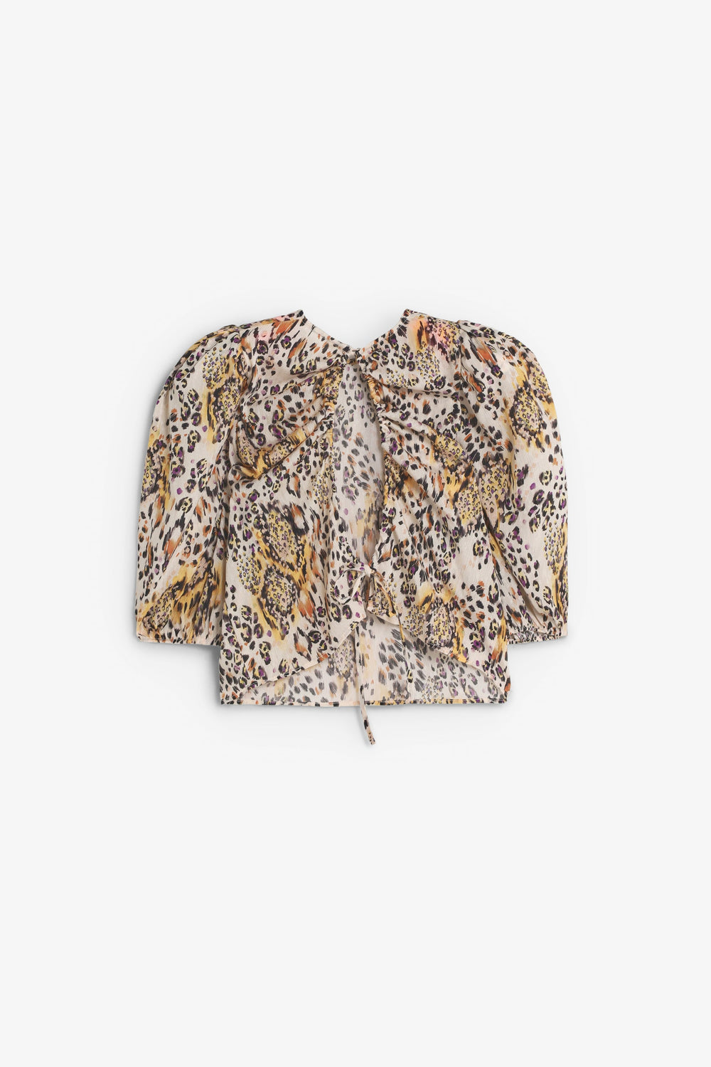 Animal print top. Round neck and short wide sleeves. Lace-up fastening at back.