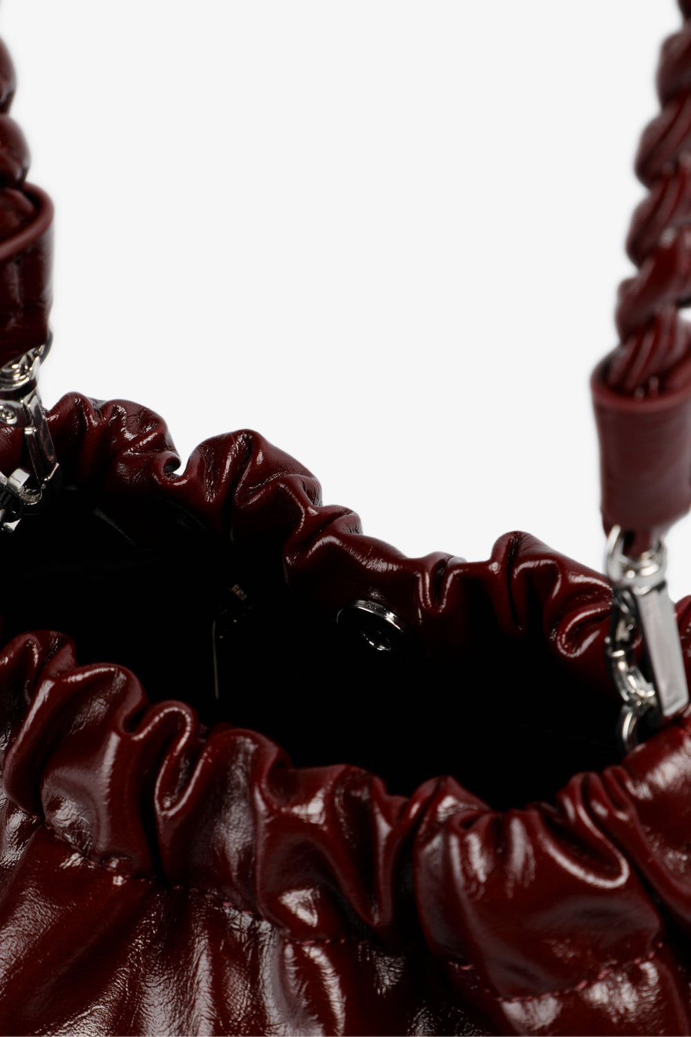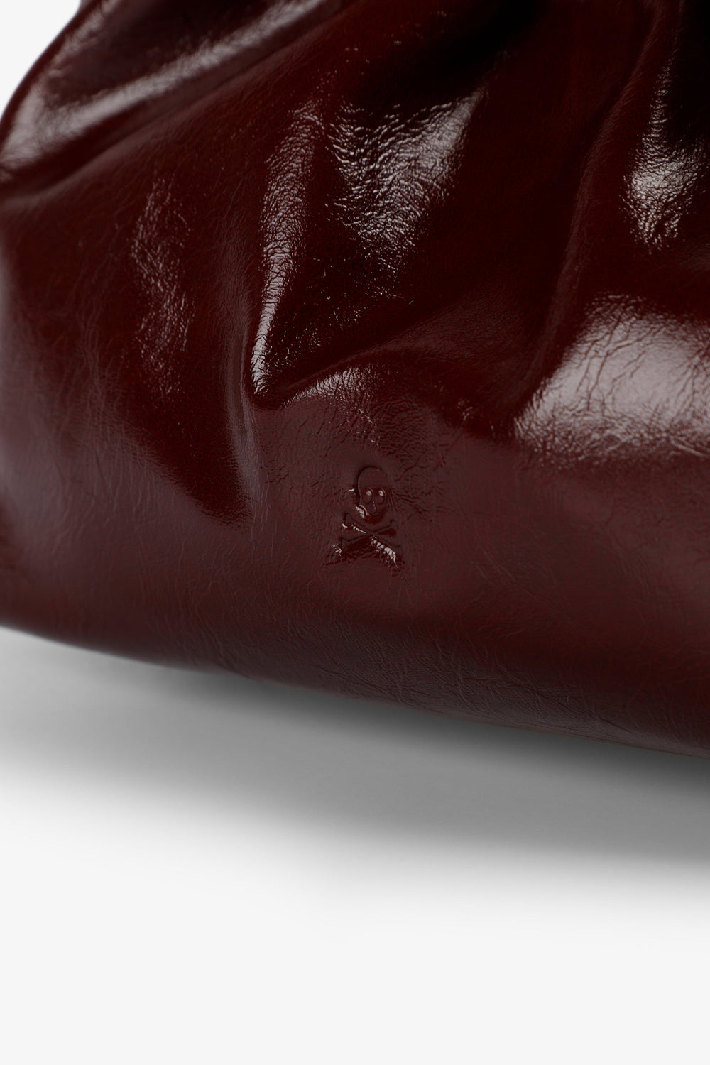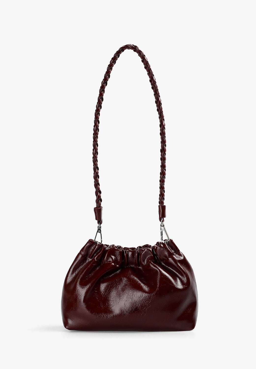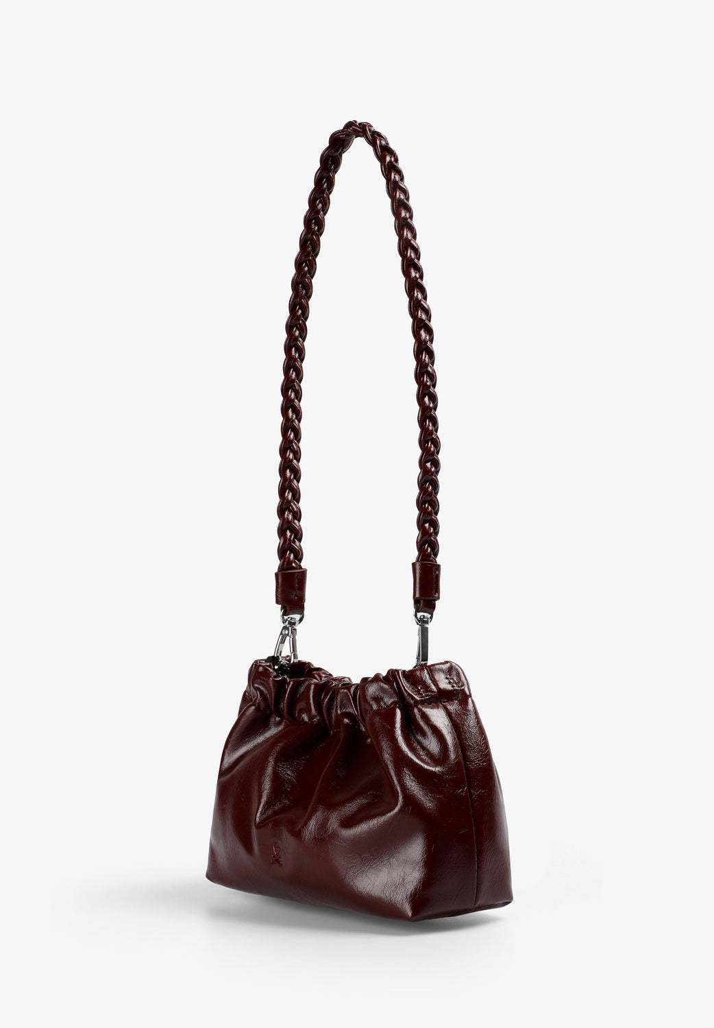 Handbag made of PU. Long detachable strap. Magnetic button fastening. Engraved logo detail on front.