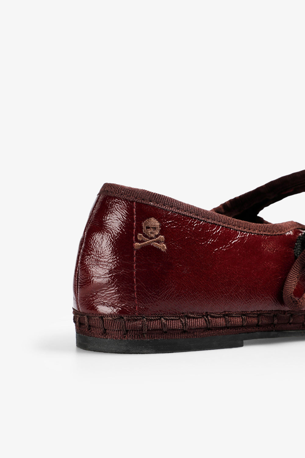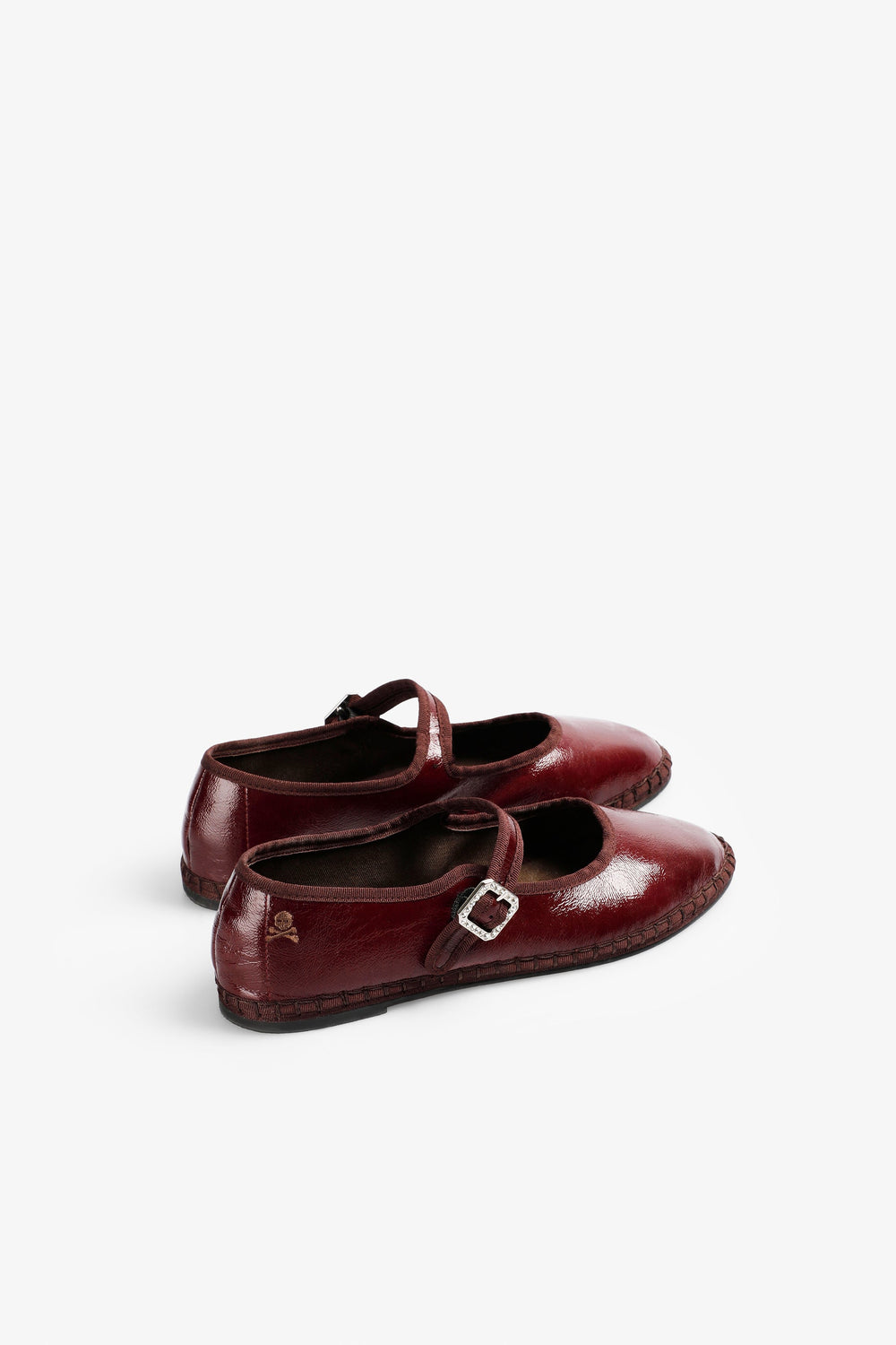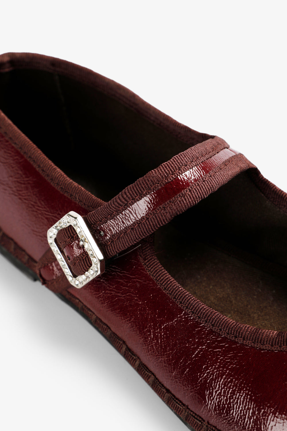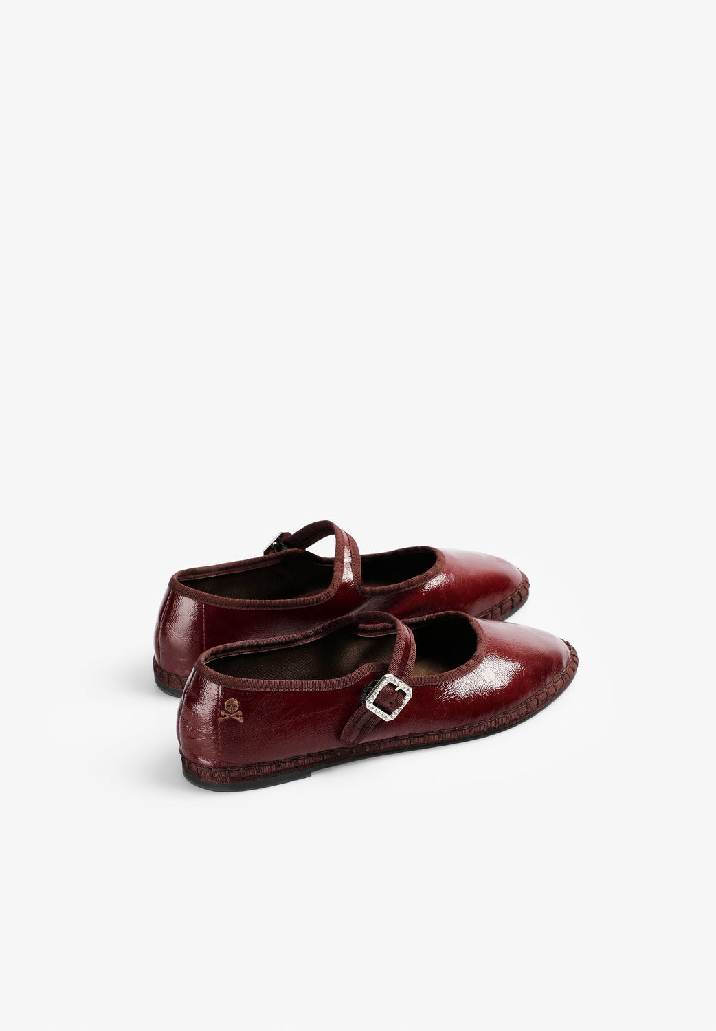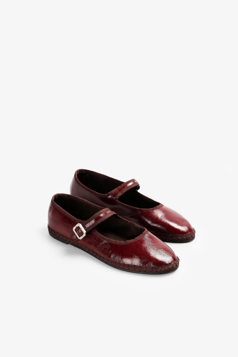 Ballet flats made of faux patent leather. Customised buckle fastening on strap. Tonal engraved logo detail.