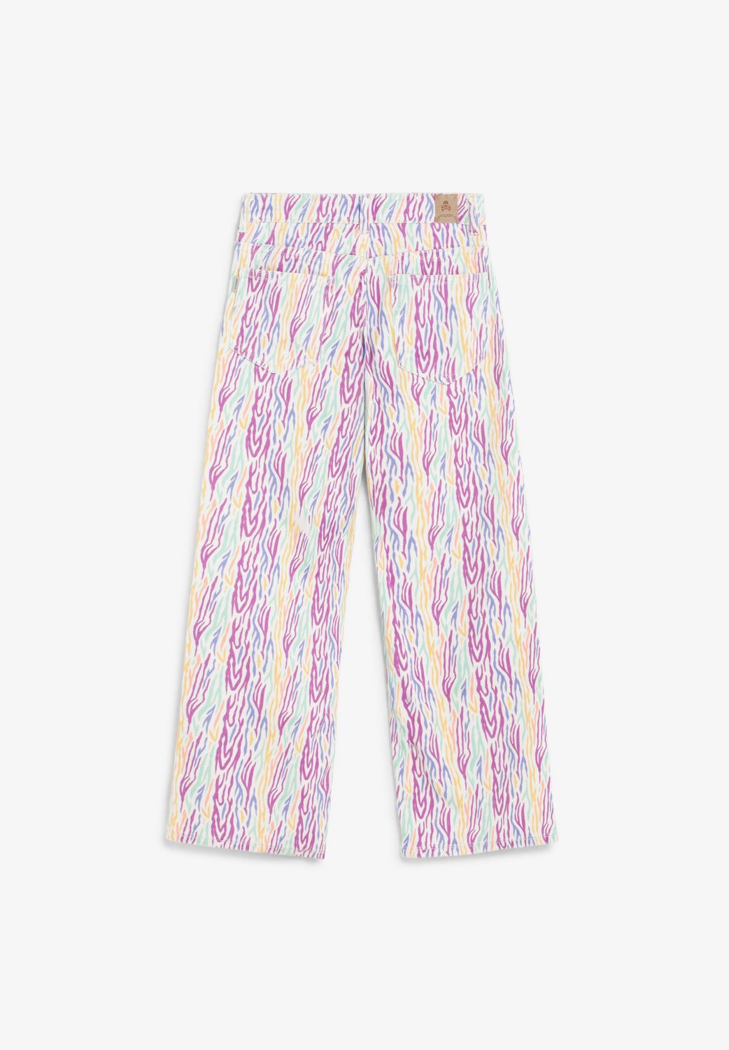 Wide leg jeans made of slightly stretchy cotton fabric. Multicoloured print. Front button and zip fastening. Front and back pockets.