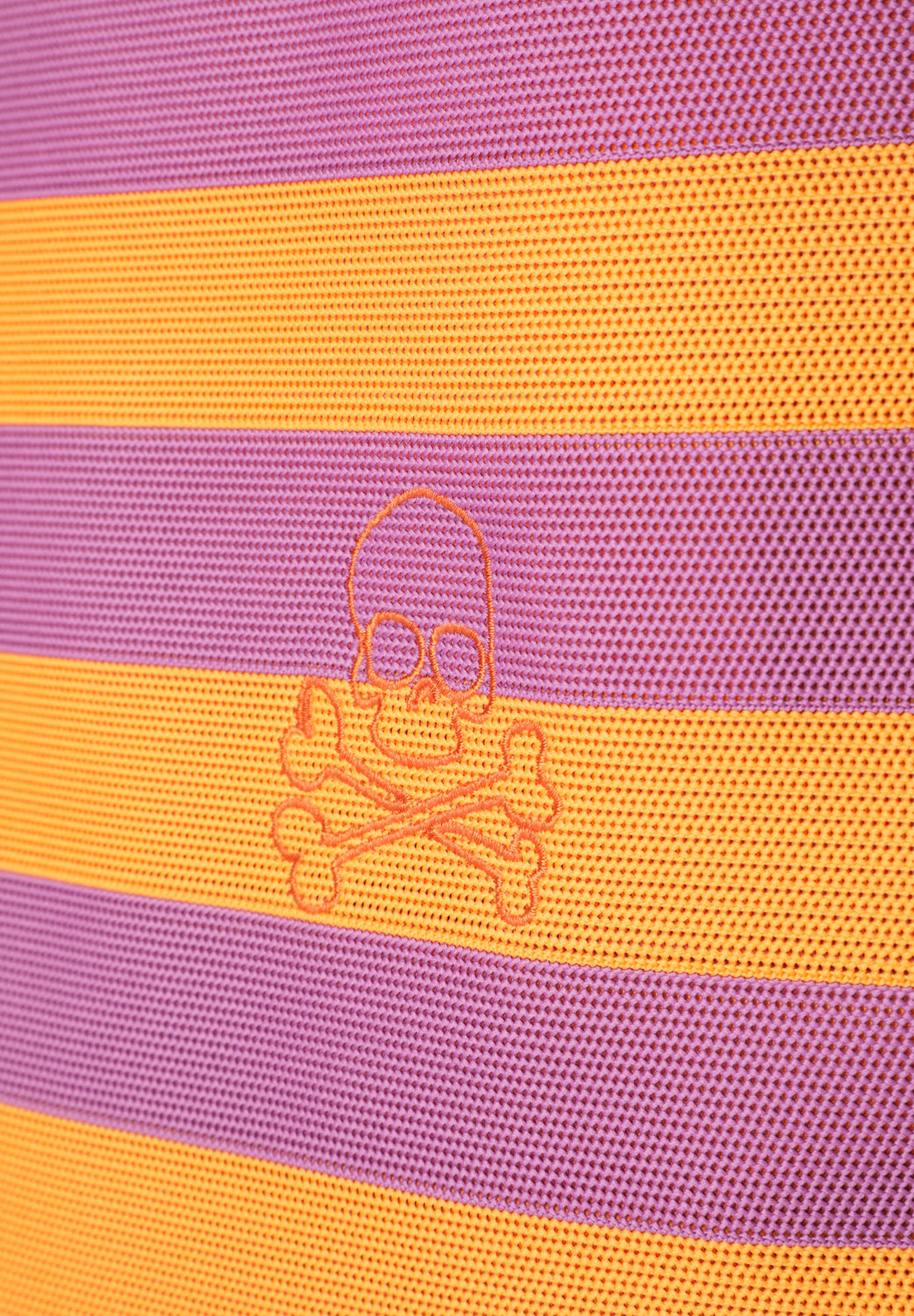 Contrast striped tote bag with two handles. Embroidered skull detail. Strap and button closure.