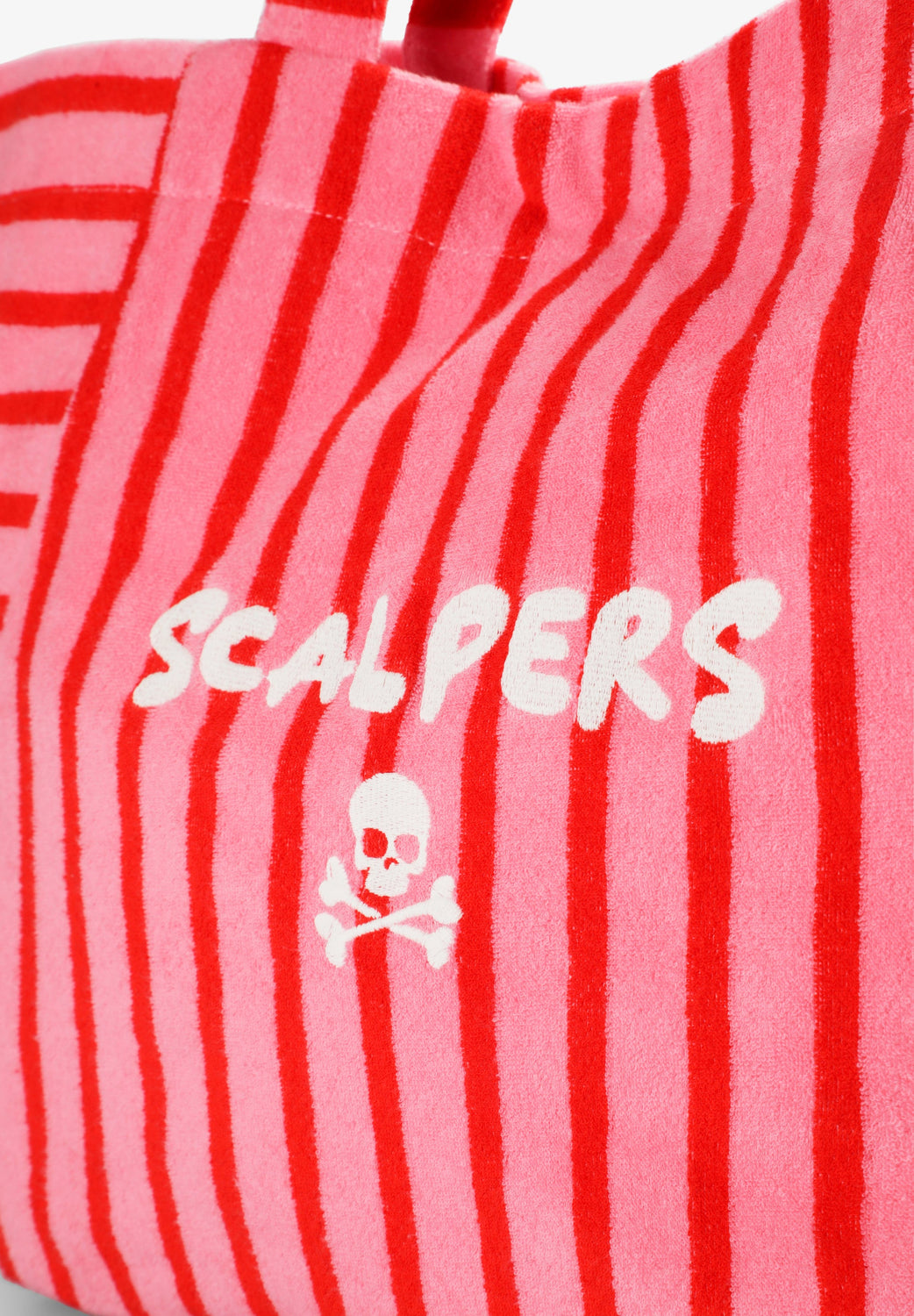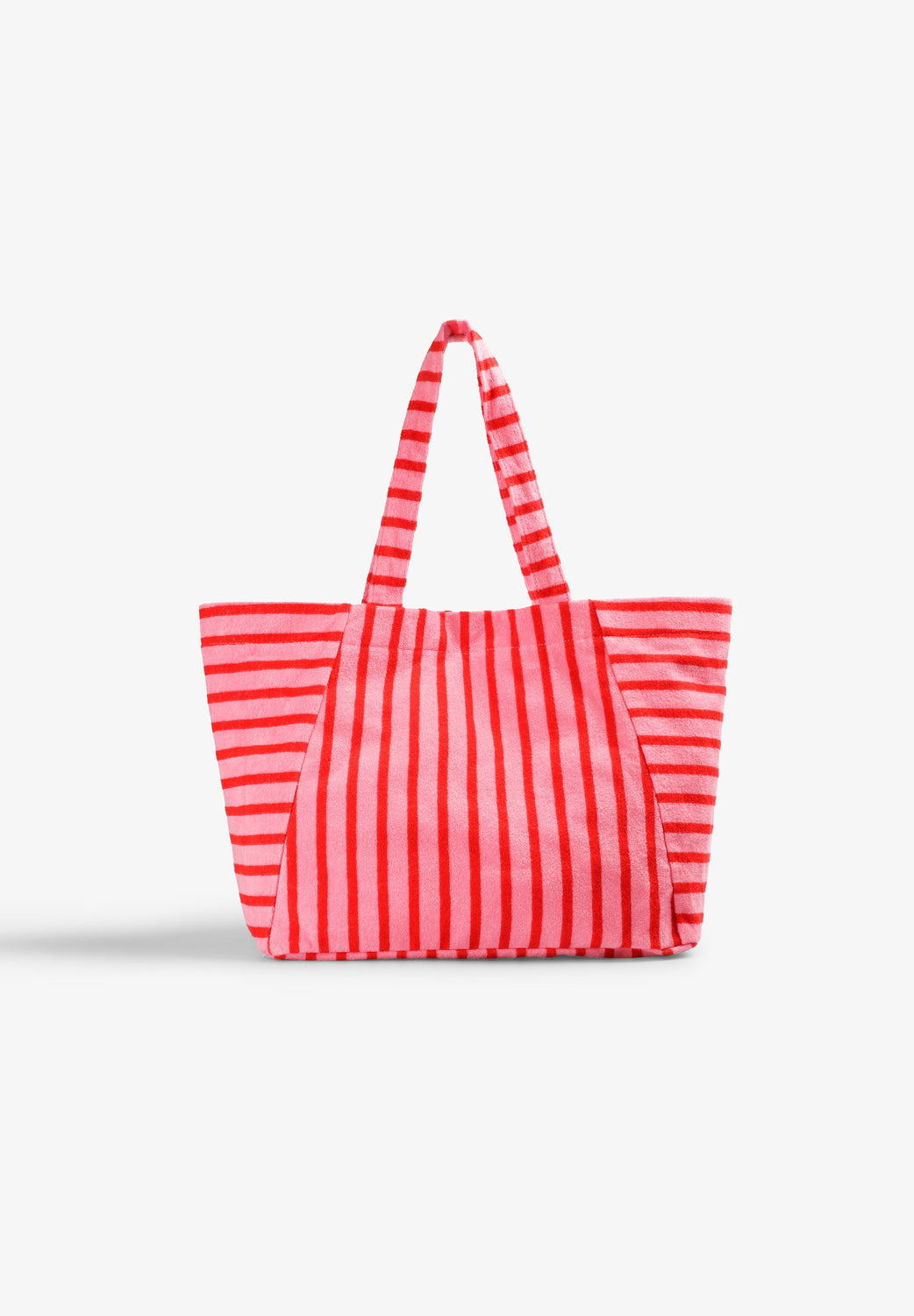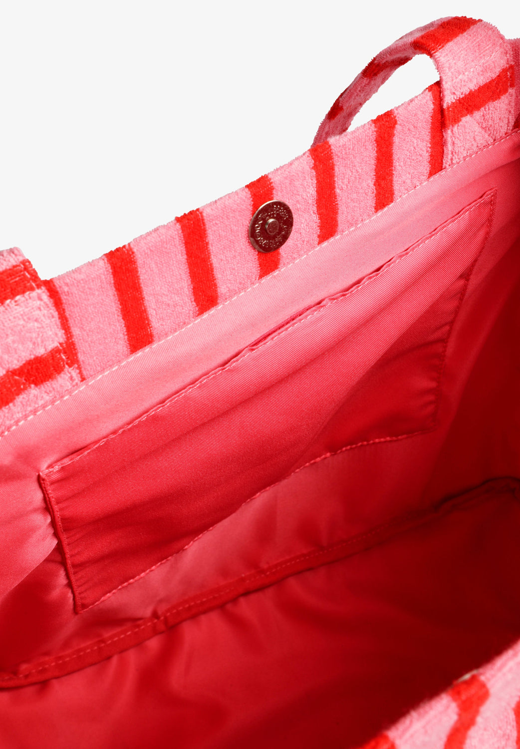 Tote bag made of terry towelling. Striped print, logo on front. Lined with inner pocket. Magnetised button fastening.