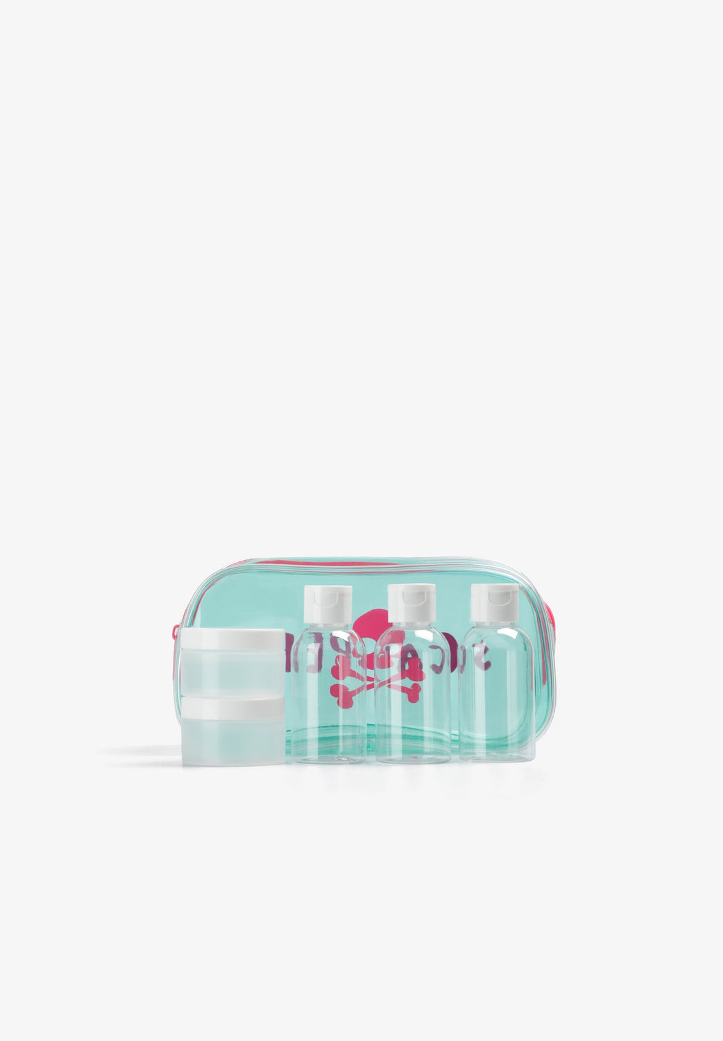 Transparent toiletry bag with zip fastening. Side print with skull and logo. Includes transparent bottles for liquids.