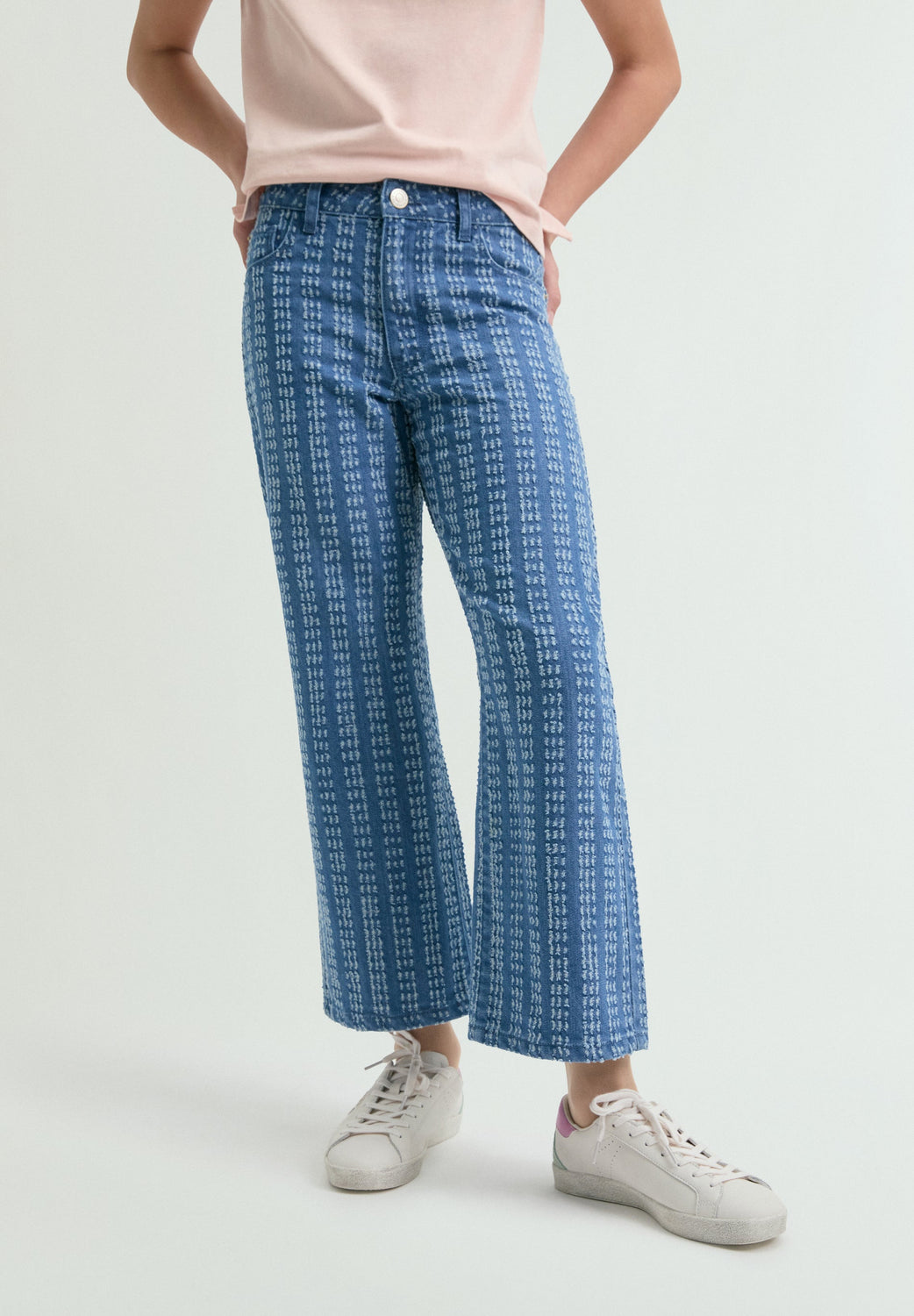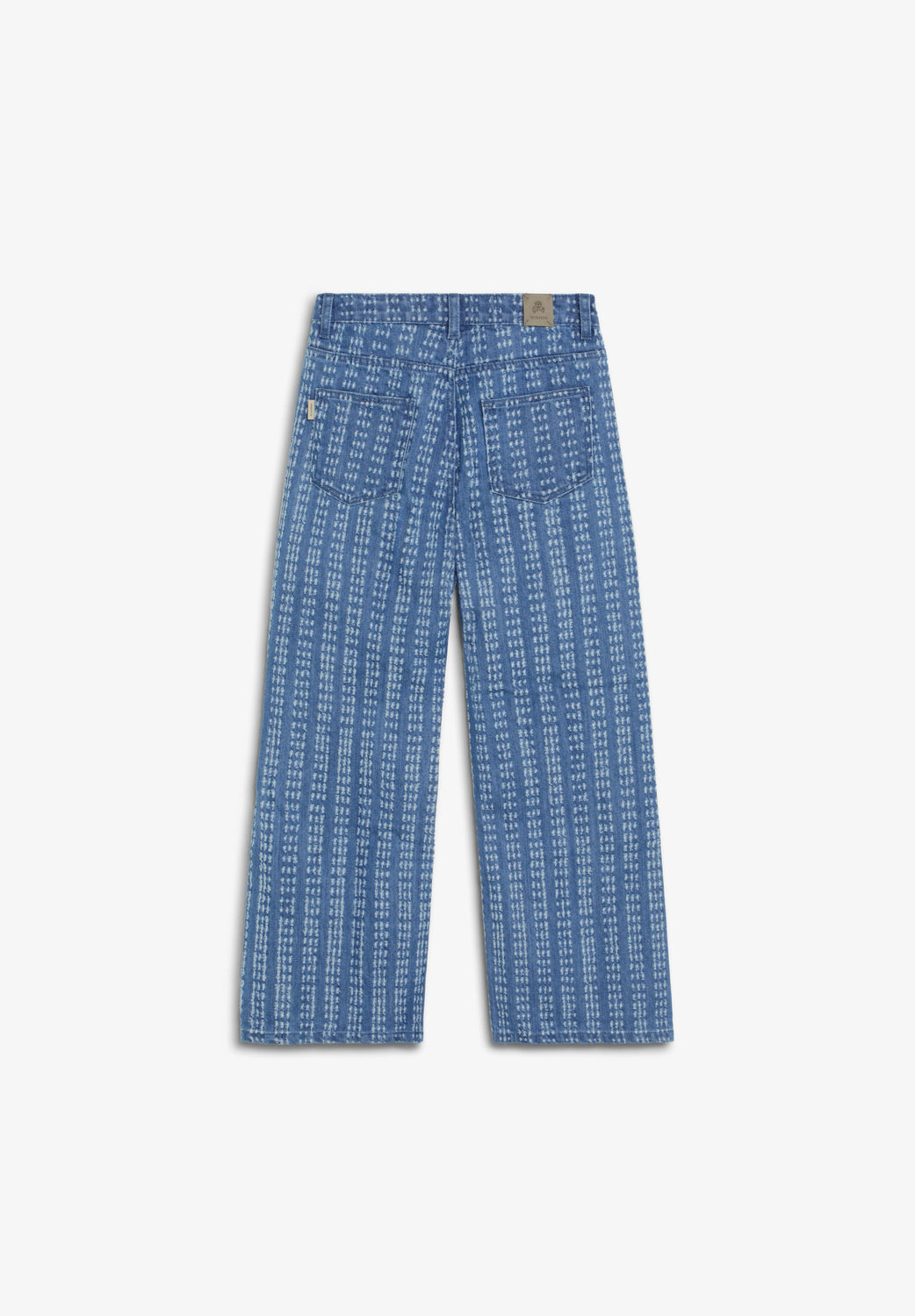 High-rise jeans high made of 100% BCI cotton. Straight cut, wide leg and ankle length design. Front button and zip fastening. Five pockets. Belt loops at the waist. Label detail on the left back pocket.