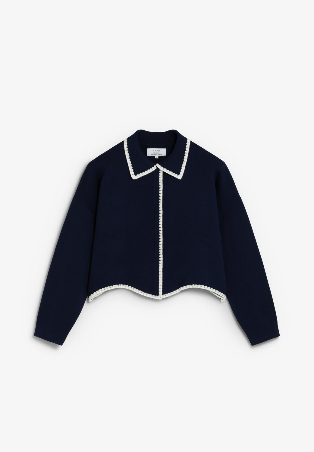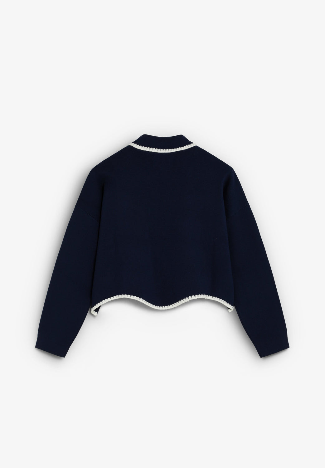 Fine knit cardigan. Relaxed fit. Shirt collar and long sleeves. Contrast openwork trim. Concealed button fastening.
