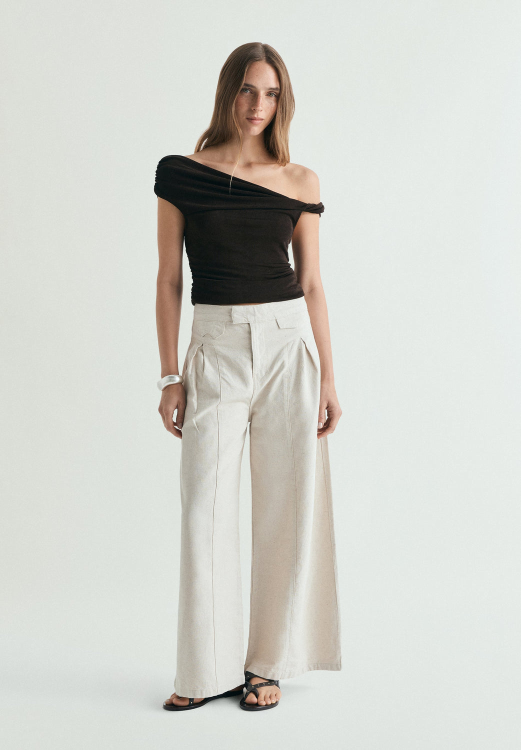 Jeans made of a cotton and rustic linen blend. Wide leg, high-rise. Waistband with concealed offset fastening and pockets with flap detail. Front darts. Patch pocket on the back.