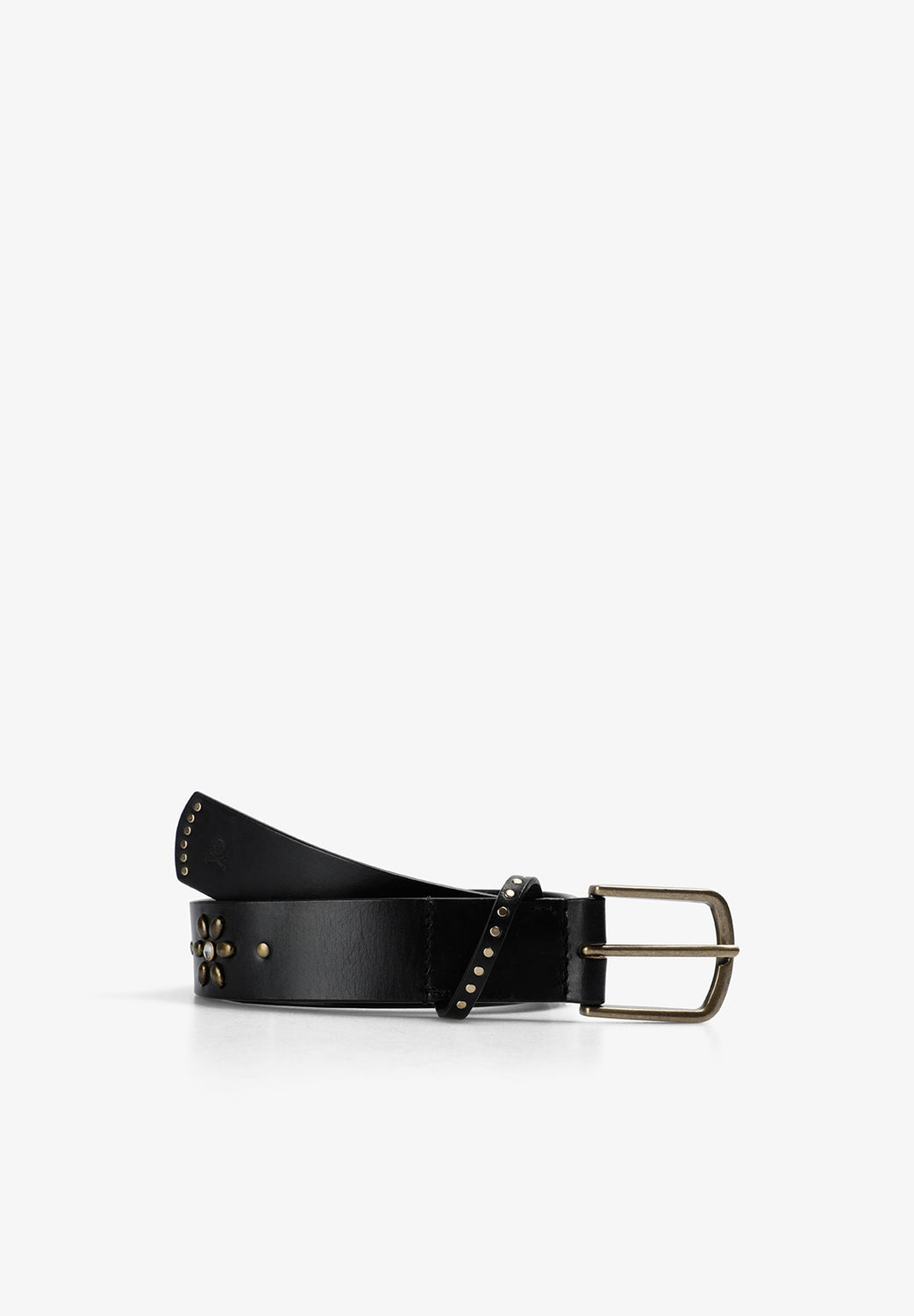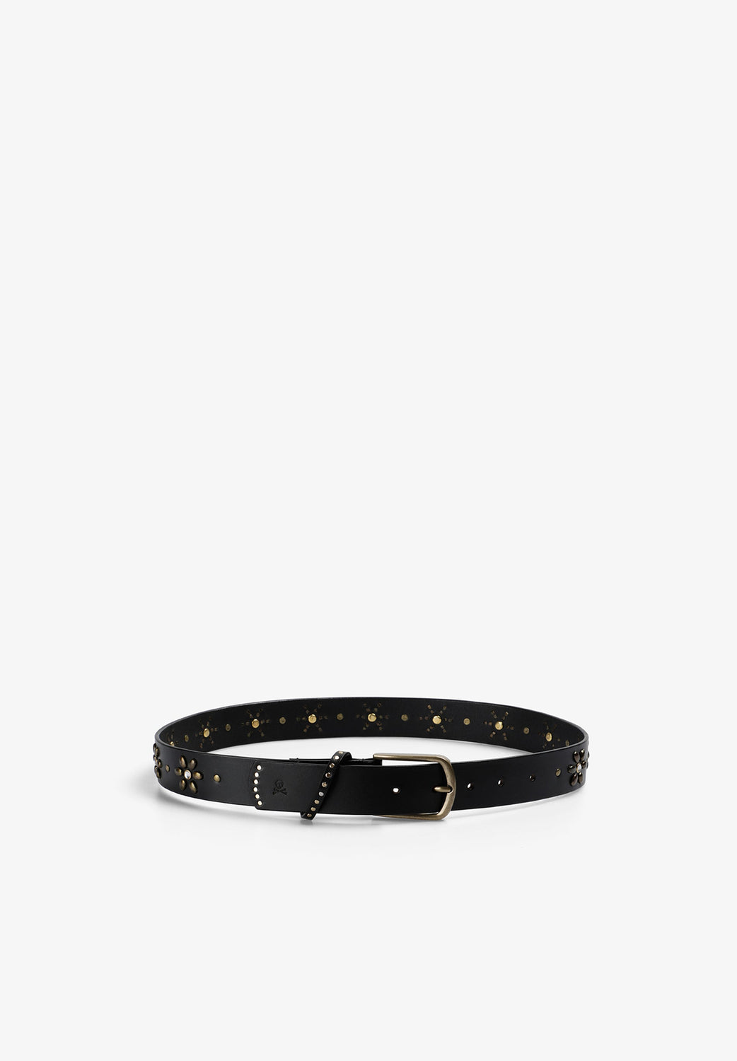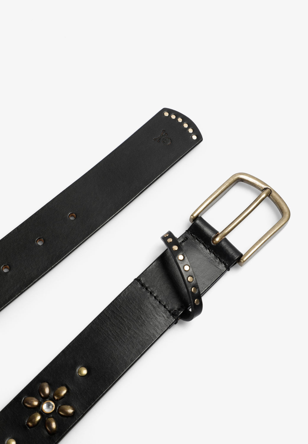 Belt made of leather with contrast decorative studs. Metal buckle fastening.