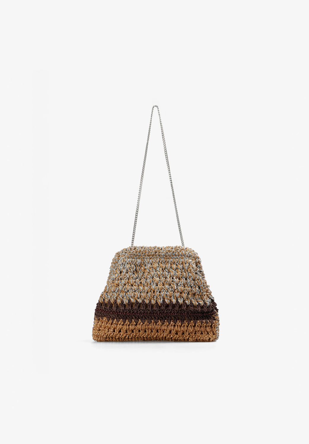Clutch bag made of braided fabric with metallic thread and beaded detailing. Lined with detachable chain strap inside.