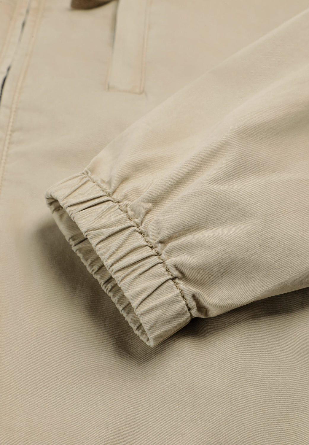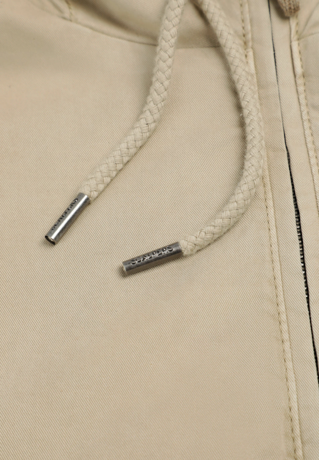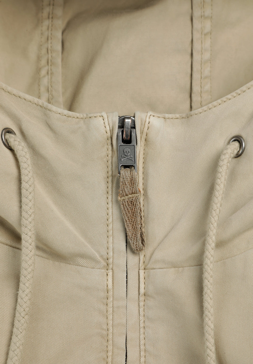 Jacket made of 100% BCI cotton. Hooded. Stand-up collar with adjustable drawstring. Three front pockets with press-stud fastening. Inner pocket. Stand-up collar Tonal skull on left sleeve.