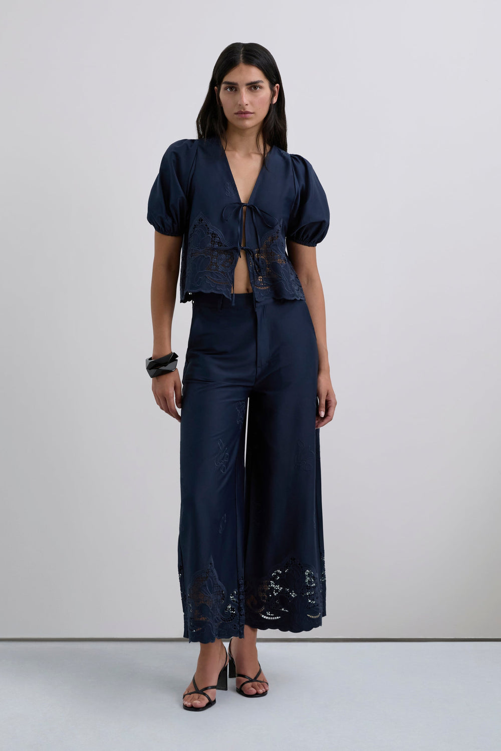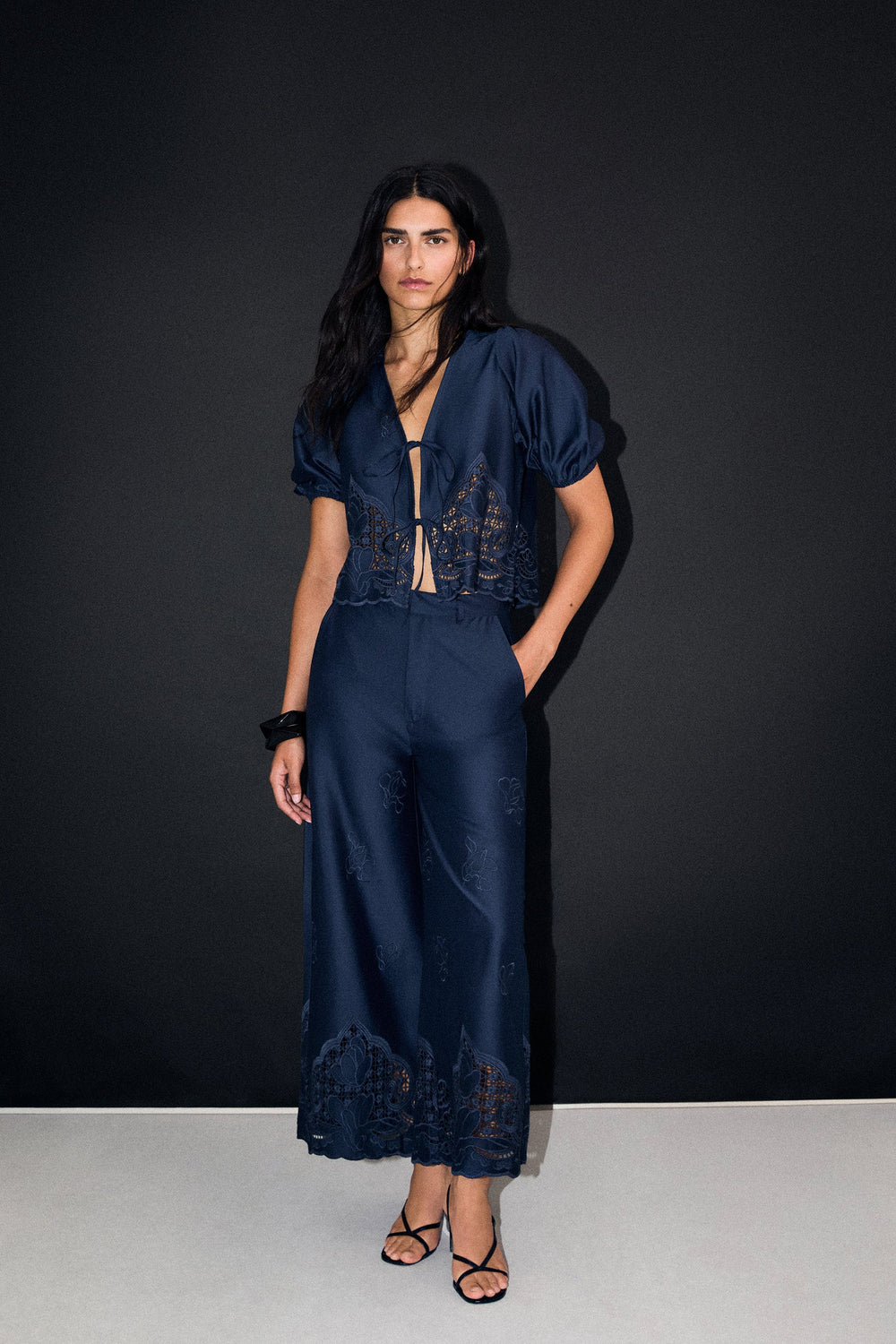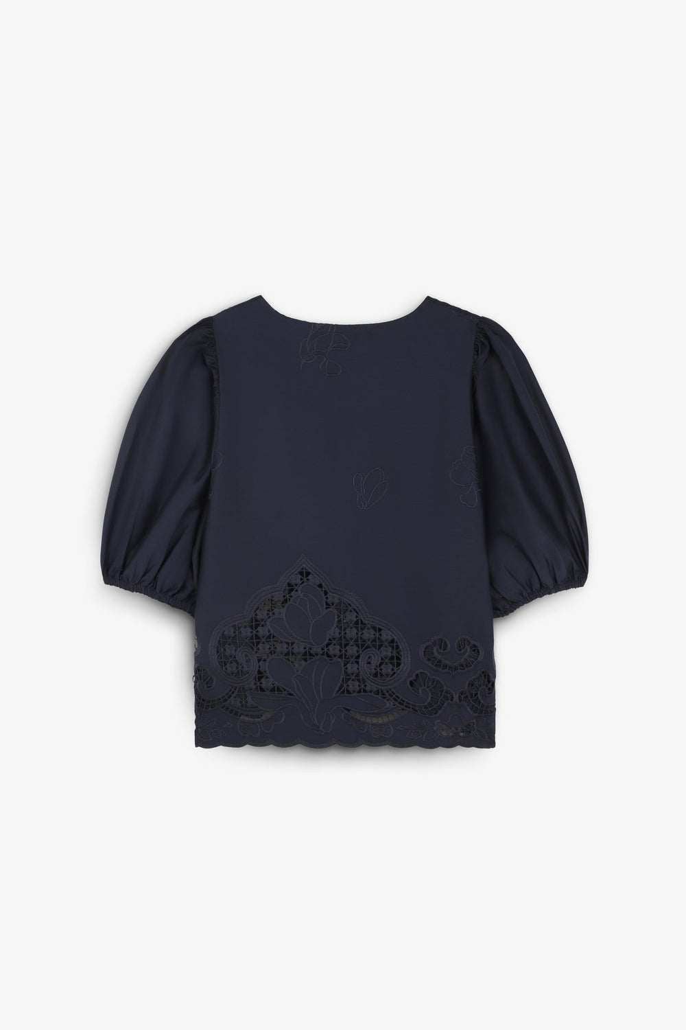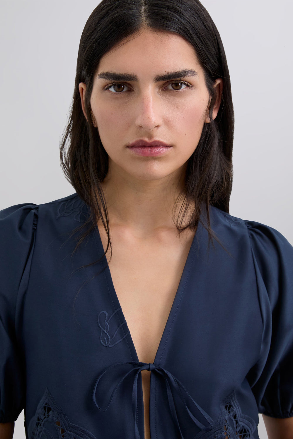 Short-sleeved blouse with slightly puffed sleeves and gathered cuffs. Fastens at front with ties. Openwork embroidery at the bottom.