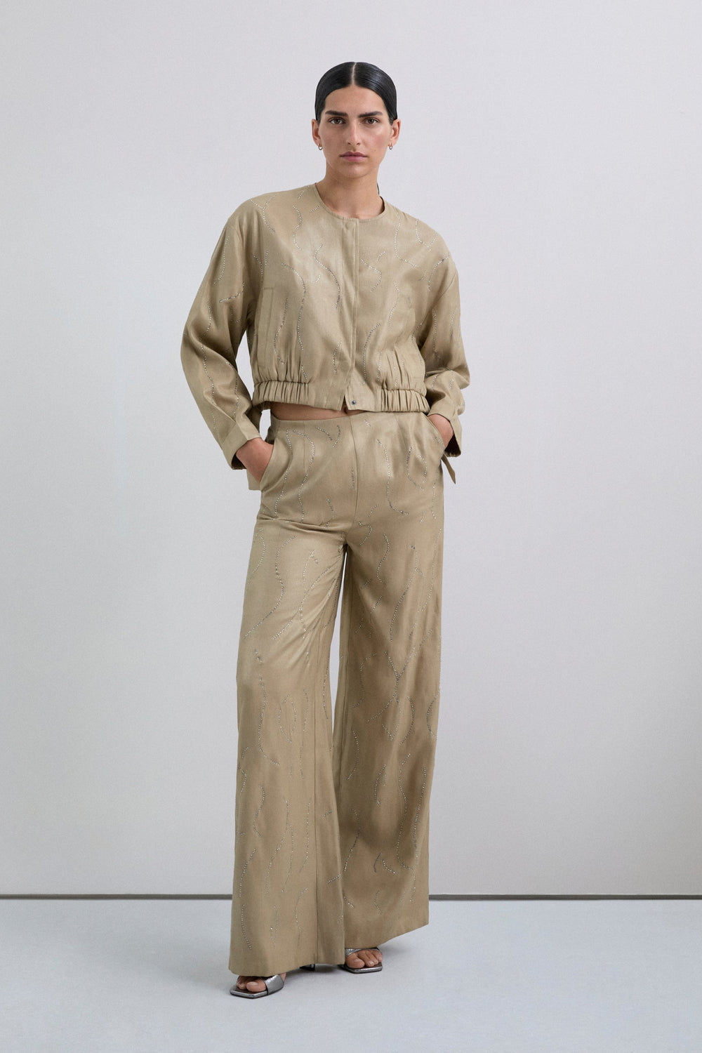 Trousers with rhinestone detailing. Elasticated waistband. Flowing fabric with satin finish. Side pockets.