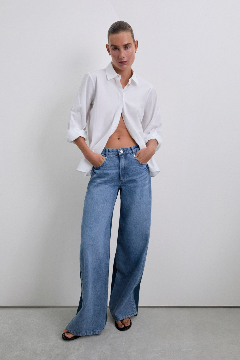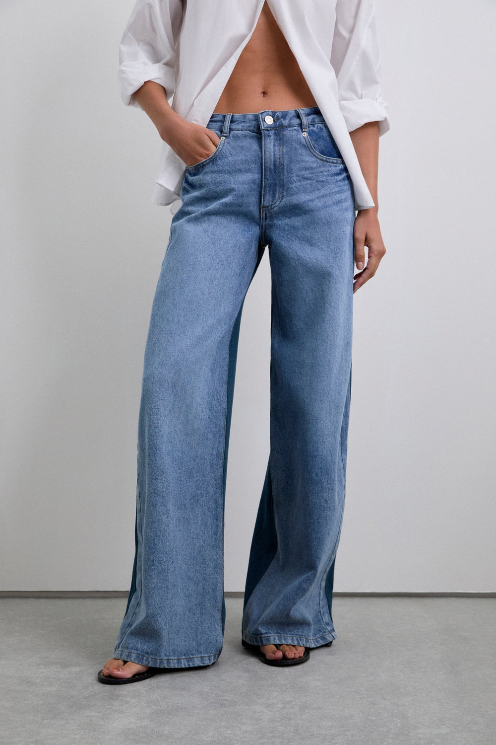 Pantalón denim confeccionado en algodón 100%. corte regular fit, bicolor, cierre con cremallera y botón, trabillas en cintura, cinco bolsillos.