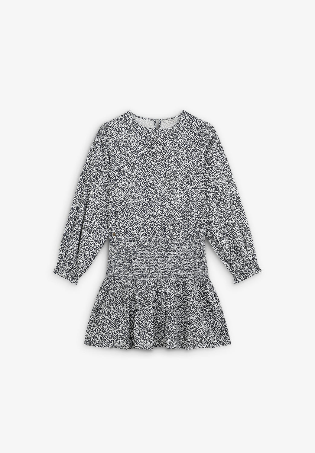 Mini dress. Regular fit. Round neck. Long, slightly puffed sleeves with gathered cuffs. Smoked and skull detail on waist. Back button fastening.