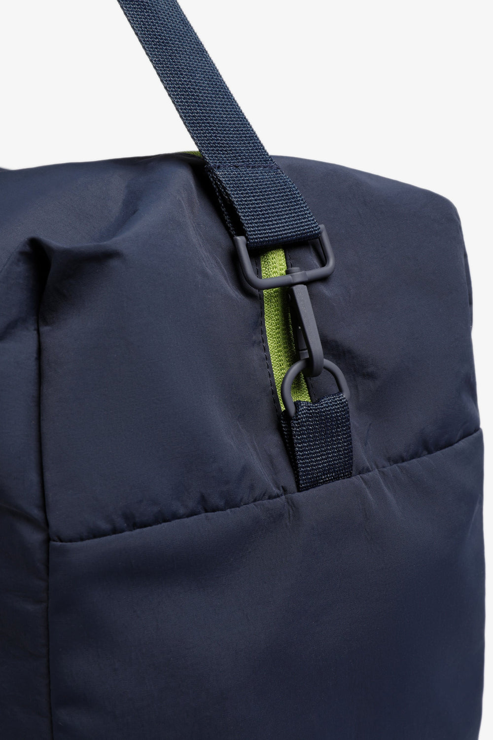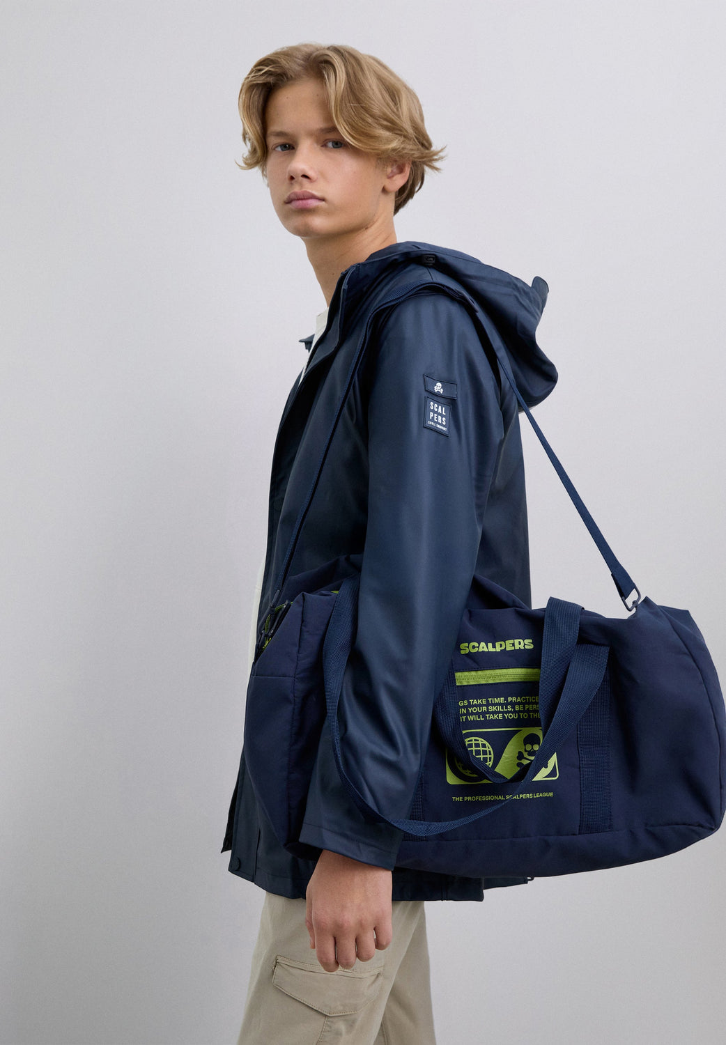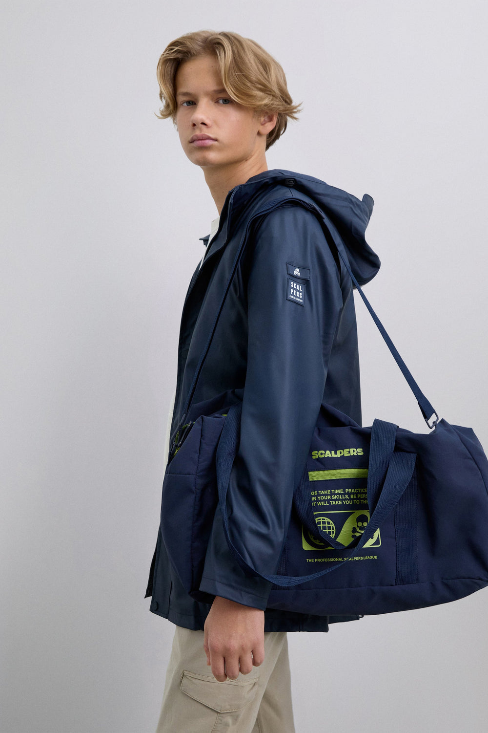 Bag made of a technical fabric. Main and side compartments with zip closure. Zip fastening, short handles and long detachable strap. Front logo and skull print.