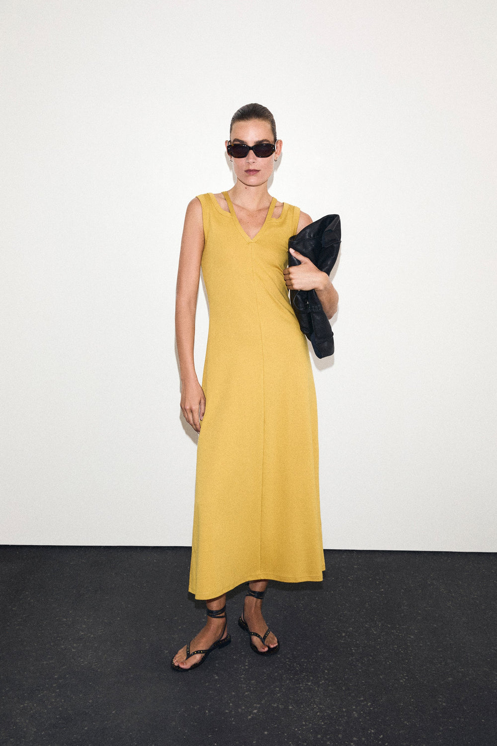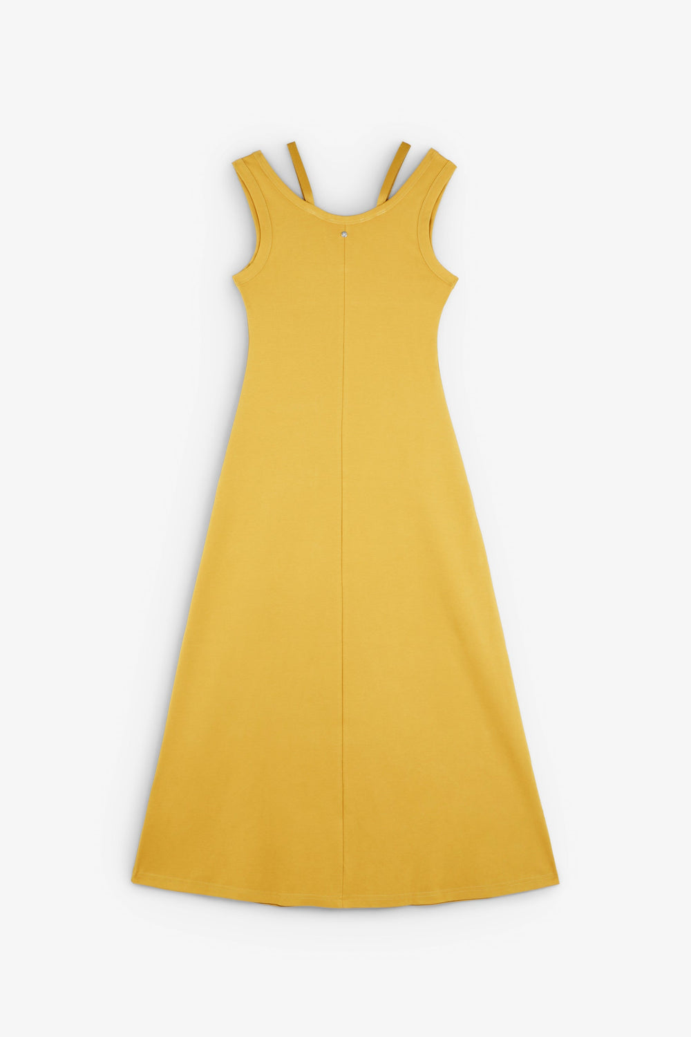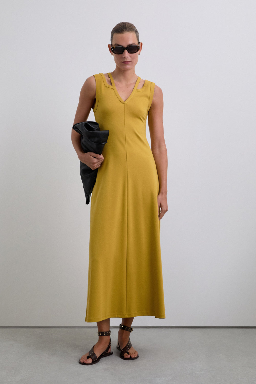 Midi dress made of 100% organic BCI cotton. Sleeveless. V-neck with cut-out details and double straps.