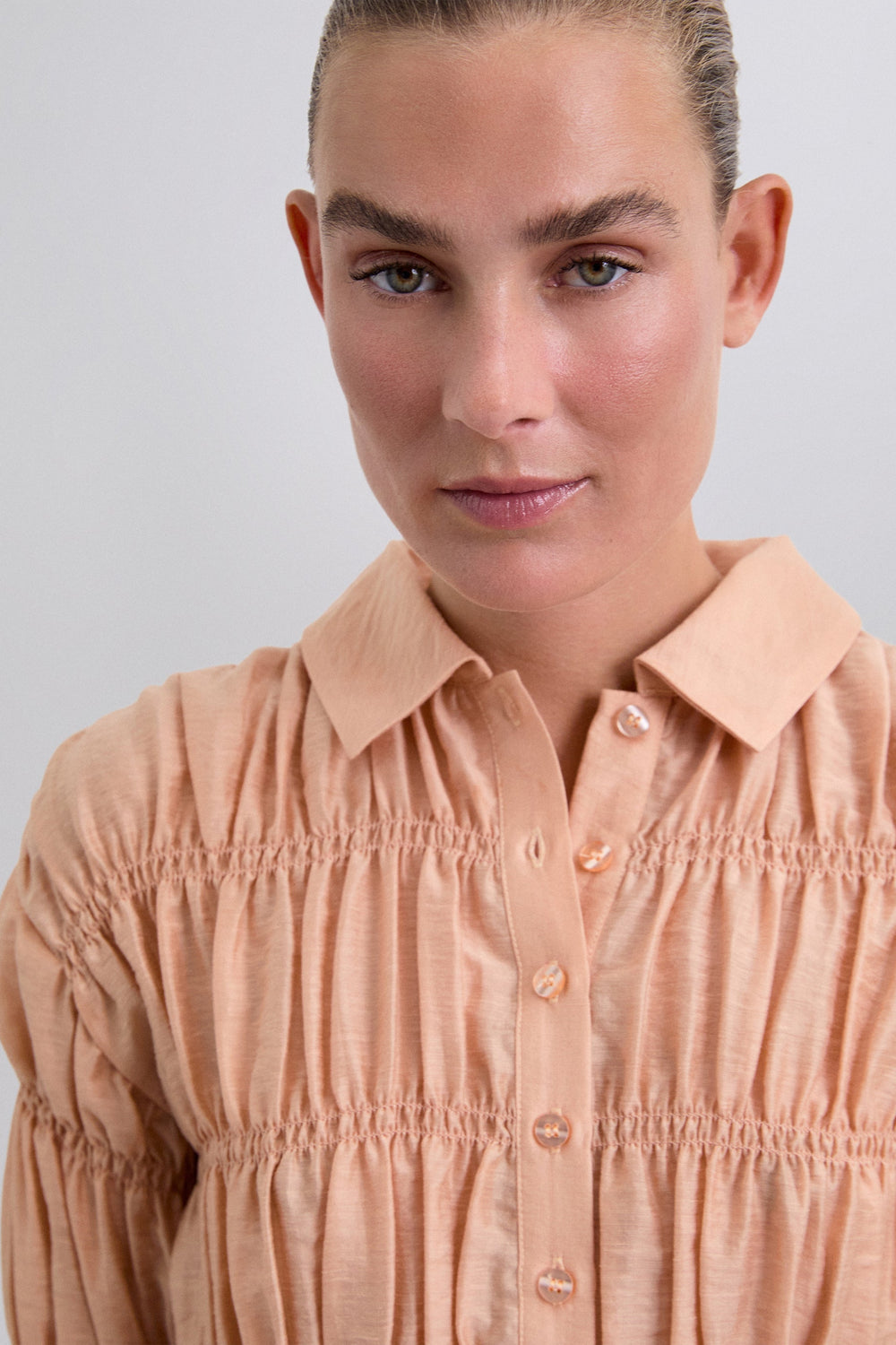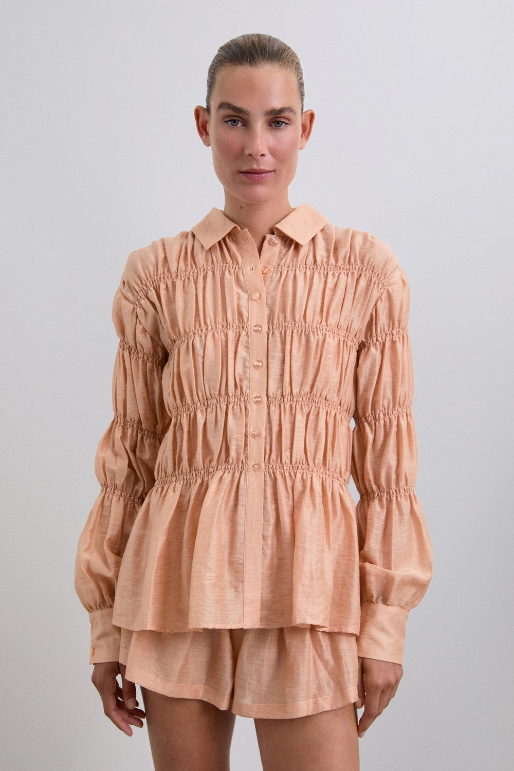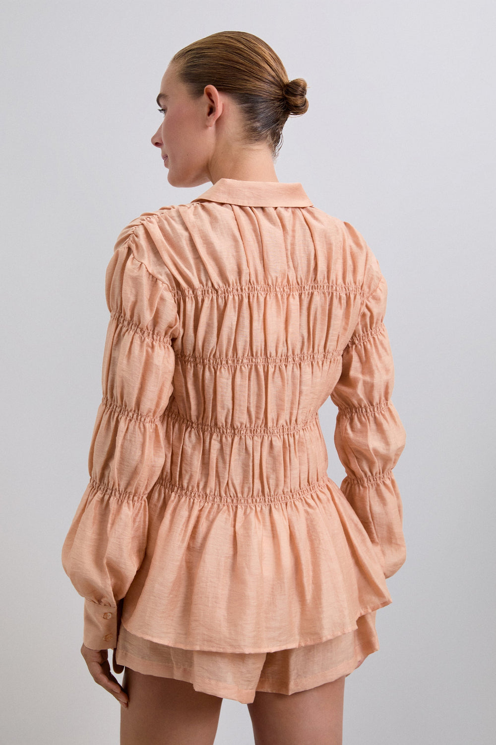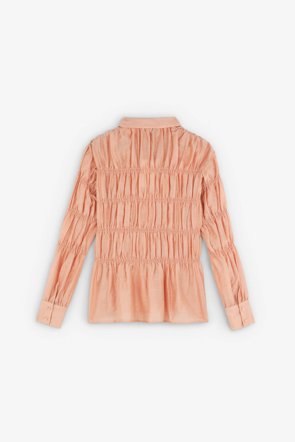 Shirt made of textured fabric. Long sleeves with smocking. Classic shirt collar fastening at the front. Slightly puffed long sleeves.