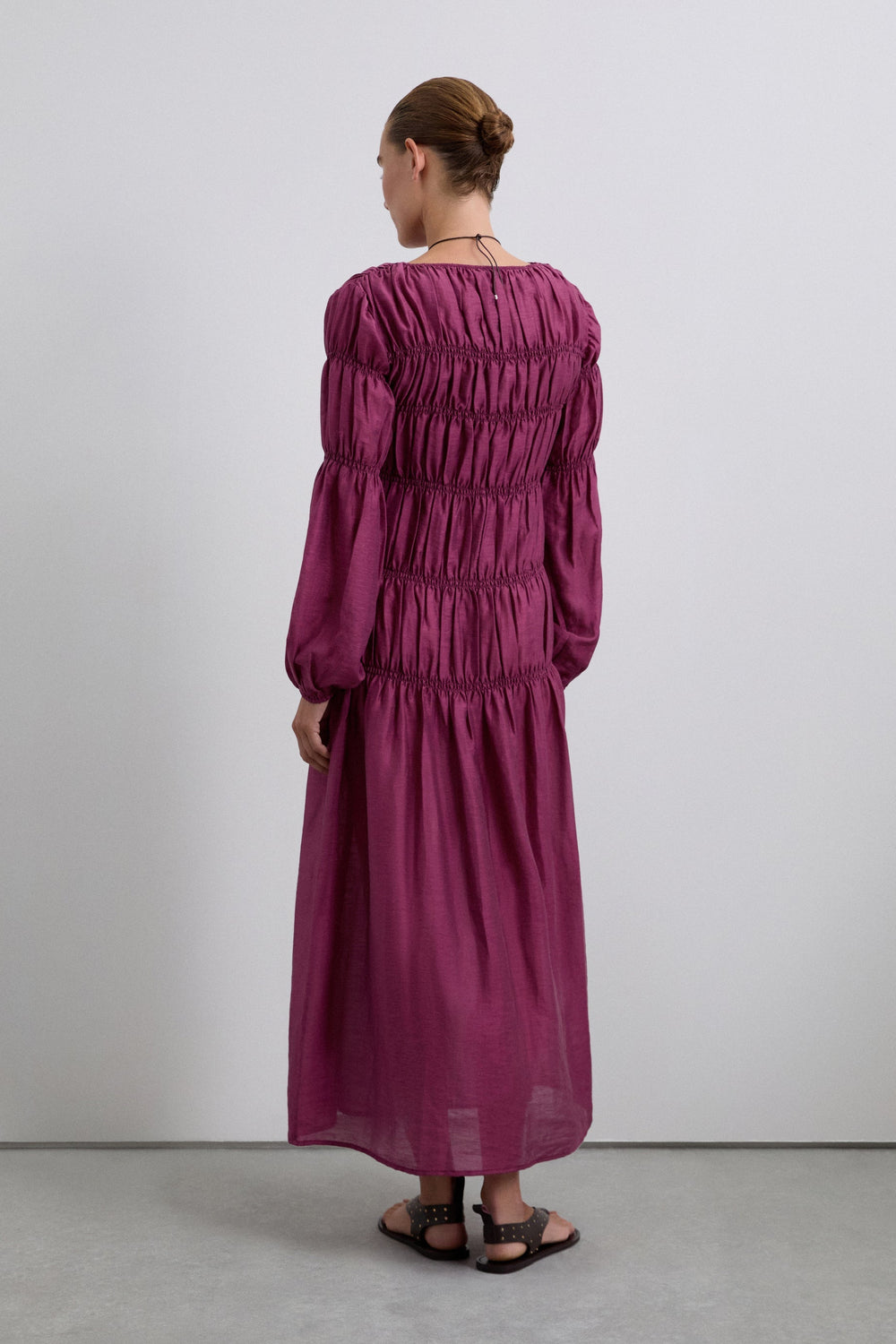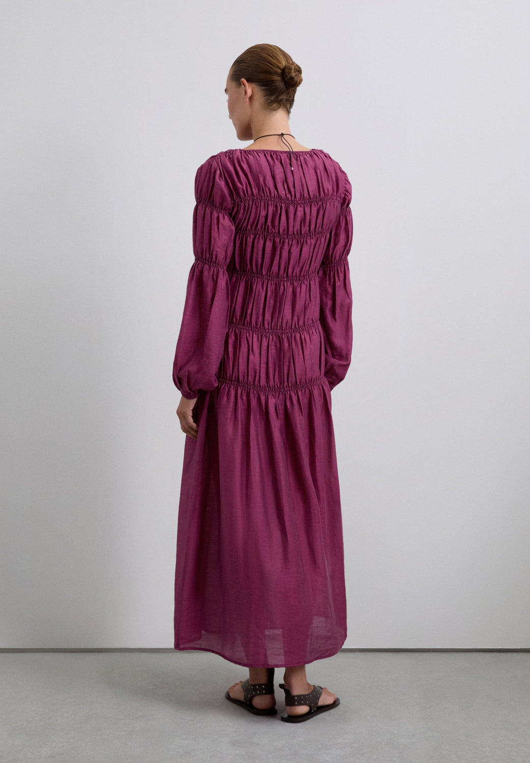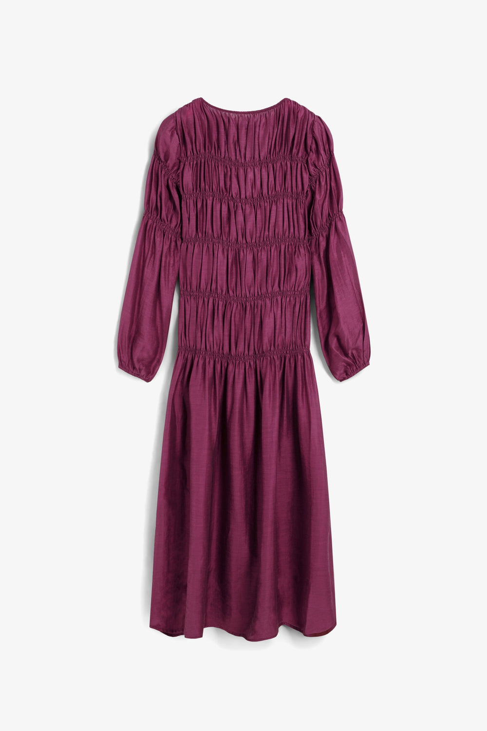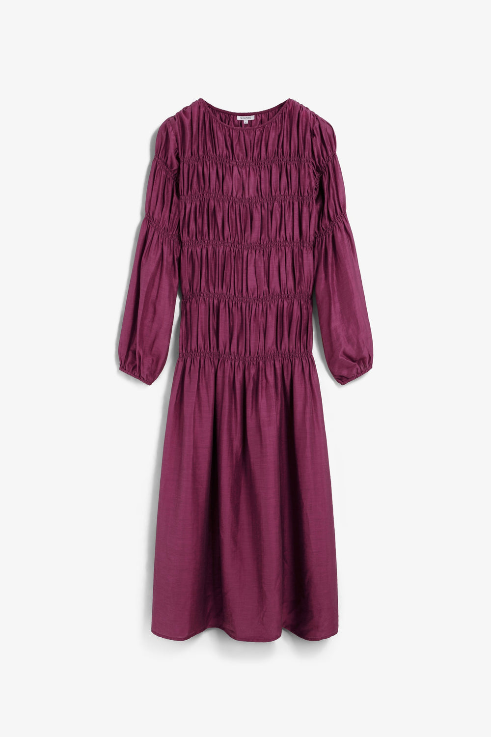 Smocked midi dress. Regular fit, round neck and long, slightly puffed sleeves.