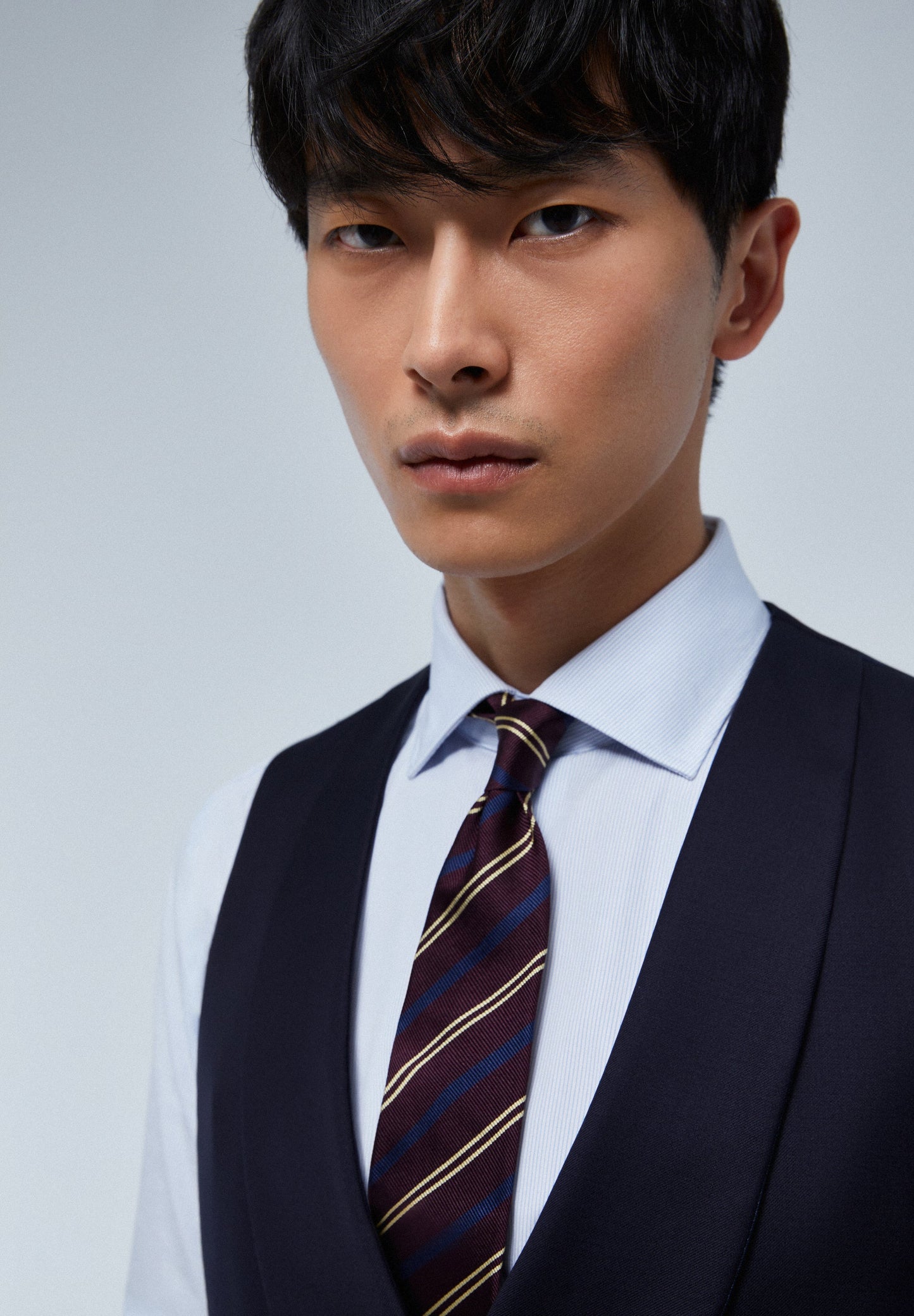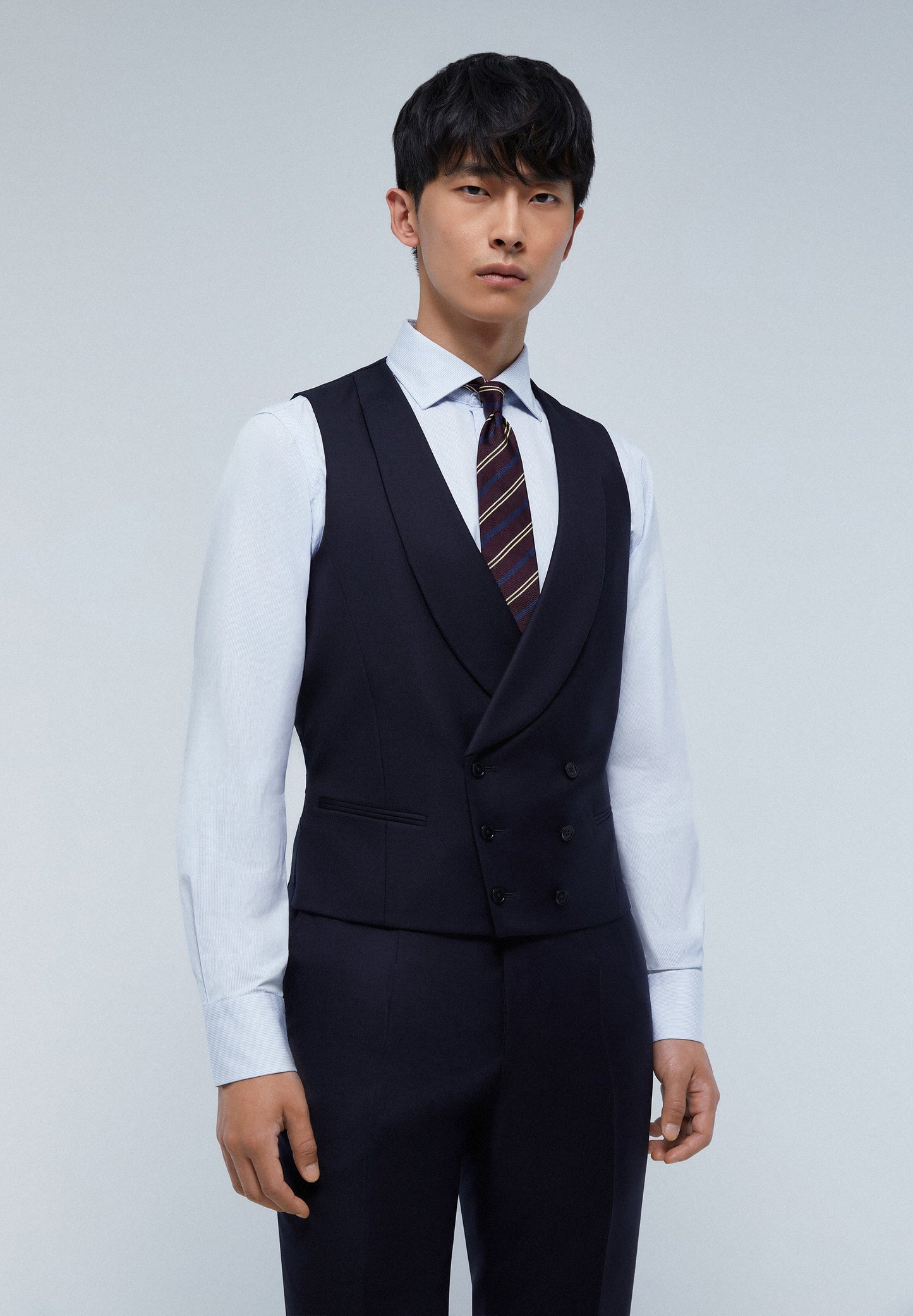Jaquette 100 % laine. Trois pièces : redingote, veste sans manches et pantalon. Coupe droite, col à revers et fermeture croisée sur le côté droit. Manches longues et poignets boutonnés. Poche passepoilée au niveau de la poitrine et boutons à l’arrière. Disponible dans deux couleurs.