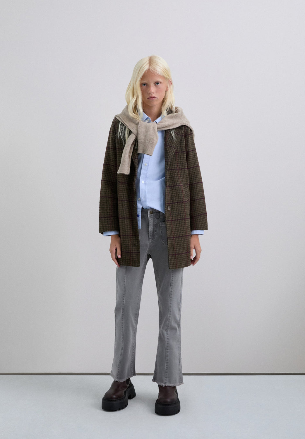 Checked cloth coat. Lapel collar. Button fastening. Long sleeves. Jetted flap pockets.