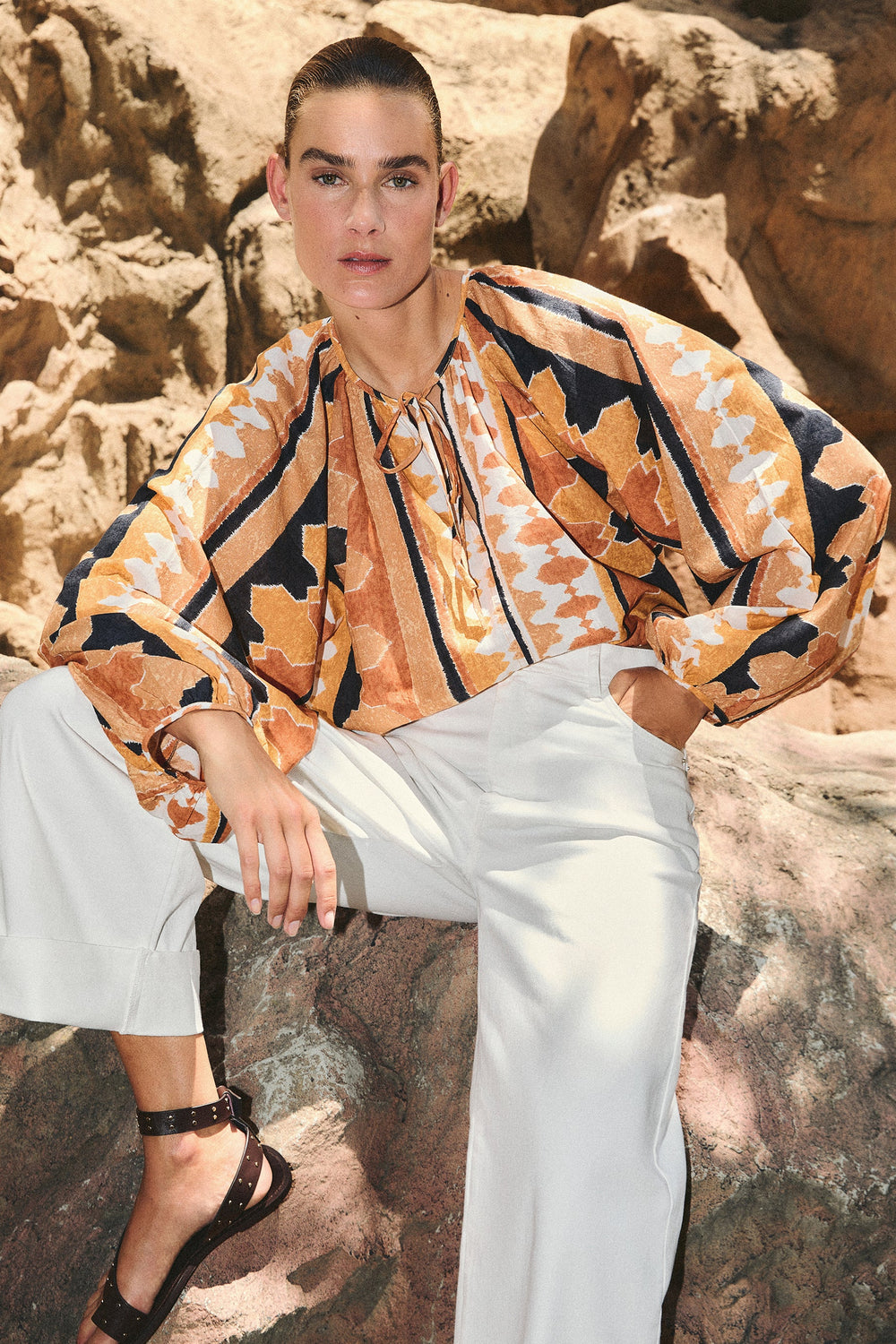 Printed shirt made of 100% organic BCI cotton. Cropped Adjustable V-neck with lacing. Long puffed sleeves. Gathered edge detailing.