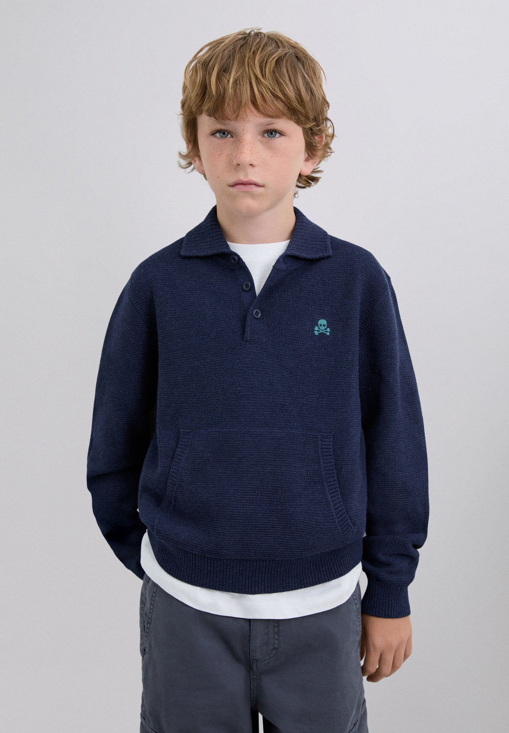 Polo shirt-style sweater. Regular fit, classic buttoned collar and long sleeves. Pouch pocket on the front.