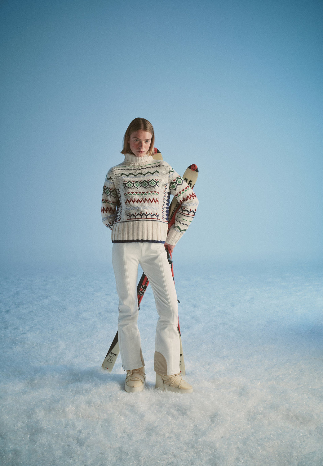 Wool blend sweater with high neck and long sleeves. Features ribbed cuffs, collar and hem. Knitted with a multicoloured print.