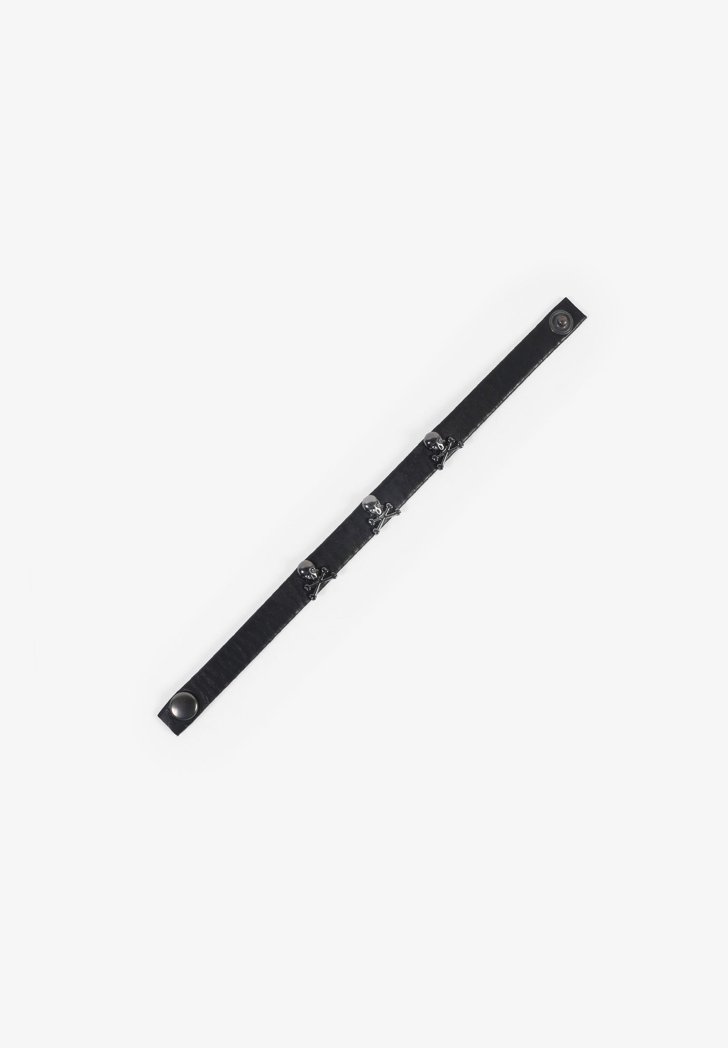 Armband gemaakt van leer, met doodskopjes. Sluiting met drukknoop.