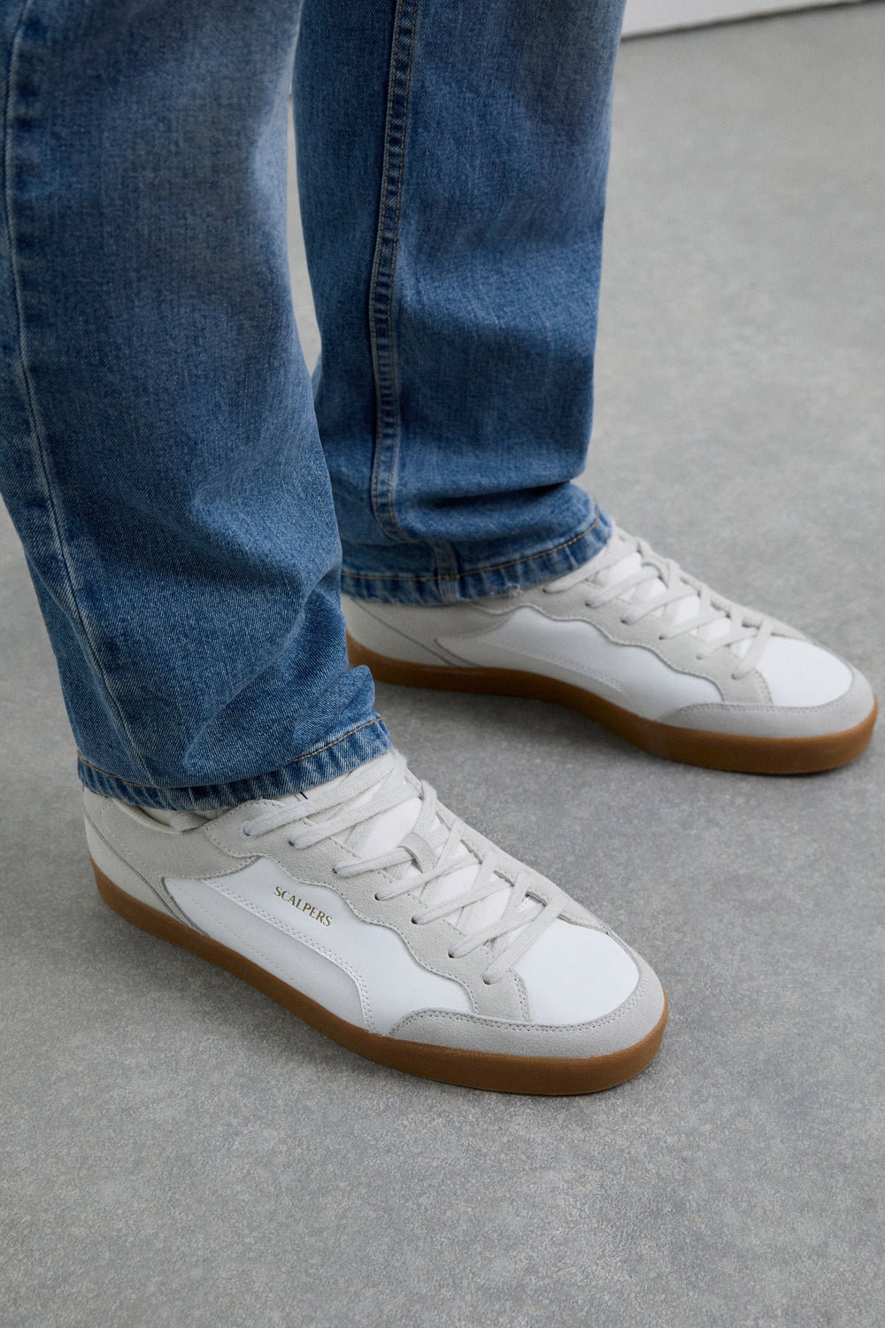 Lage sneakers gemaakt met splitleren details. Vetersluiting, rubberen contrast zool en hak achter. Label met logo.