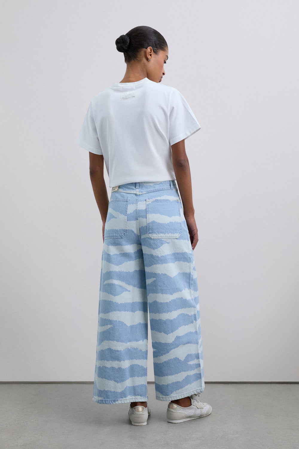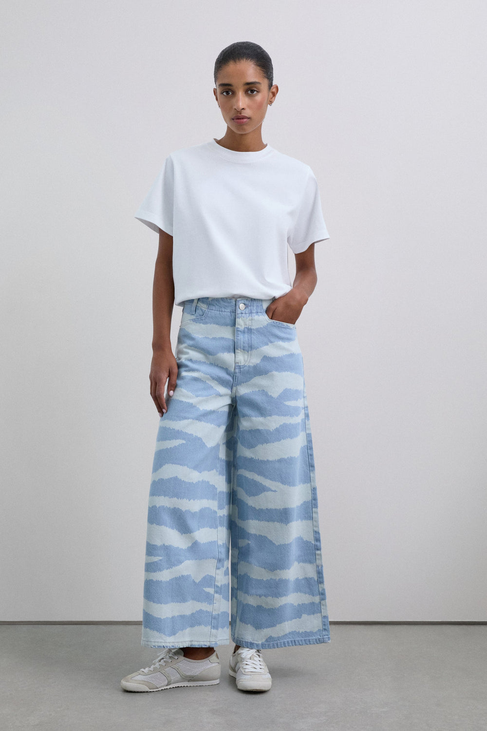 Jeans made of 100% organic BCI cotton. Culottes fit. Two front pockets and two back pockets. Zip and button fastening Animal print motif.