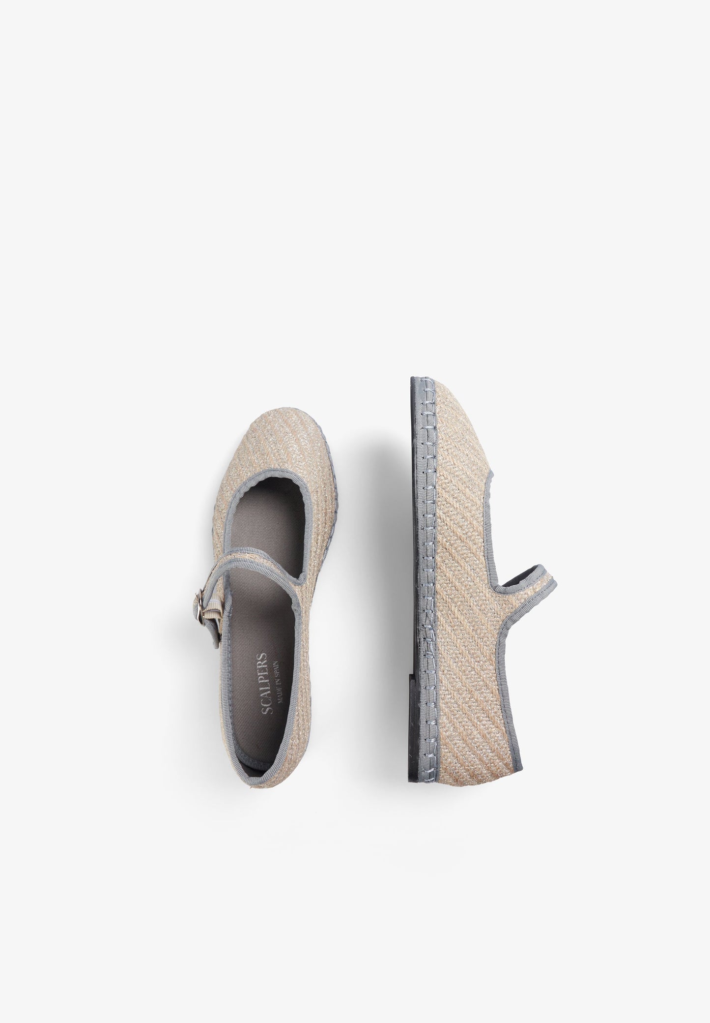 Slippers van rustieke stof met metalen gespsluiting en contrasterende zool en sierrand.