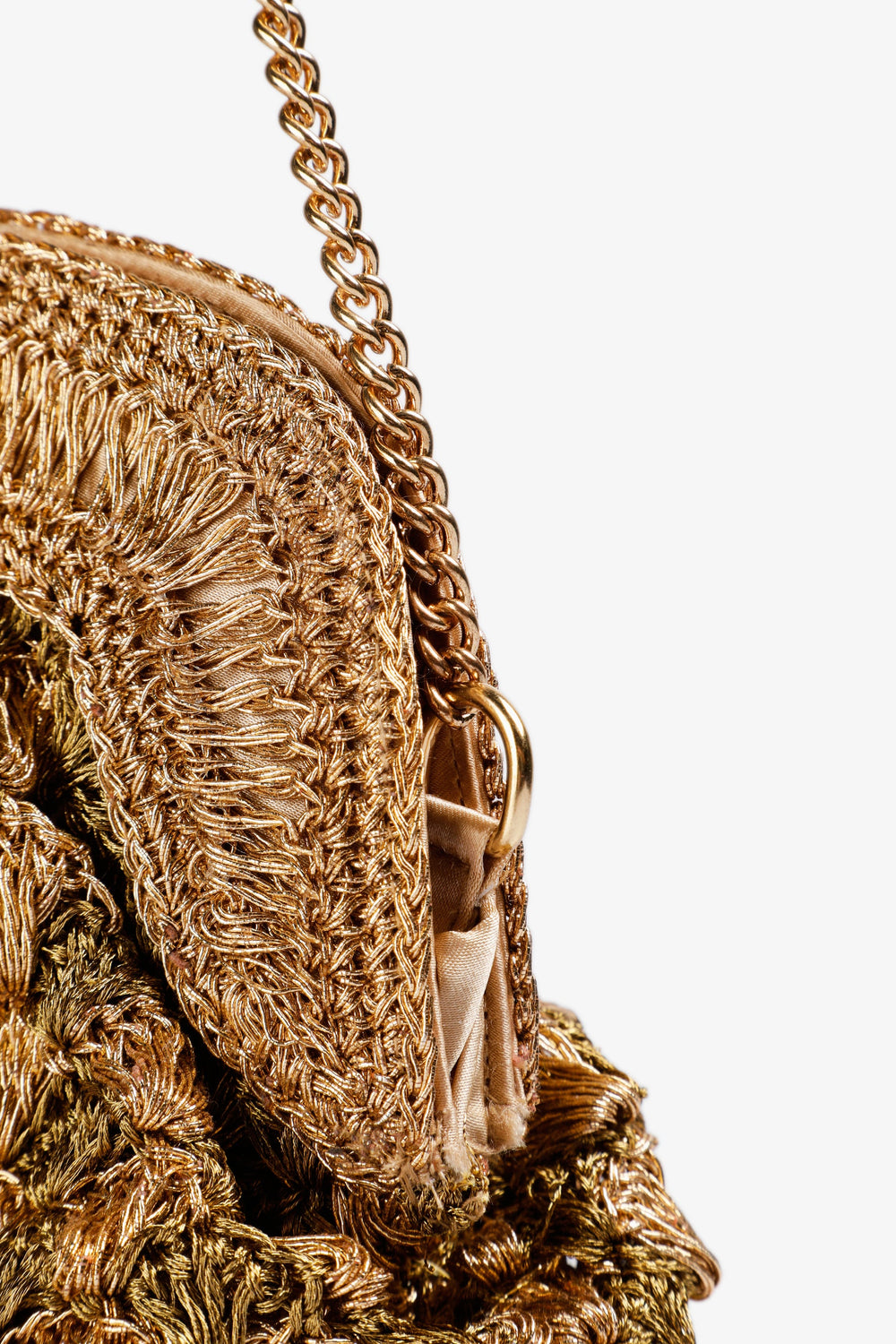 Handbag made of 100% metallic thread with 100% cotton lining. Contrast logo detail on the lining. Inner pocket and magnetic button closure.