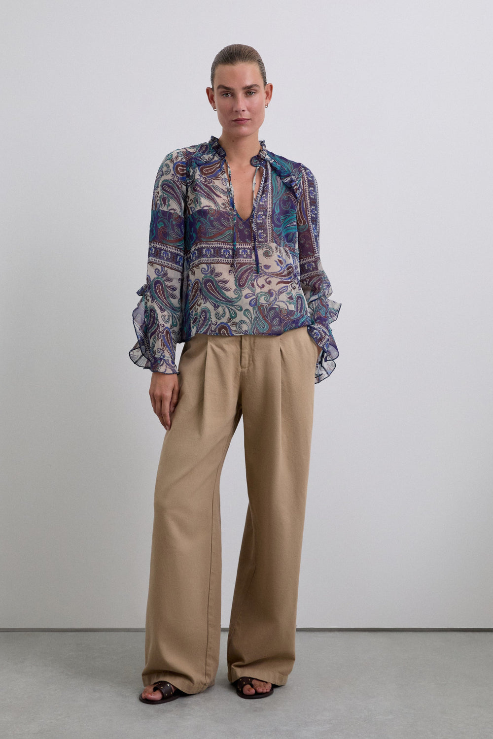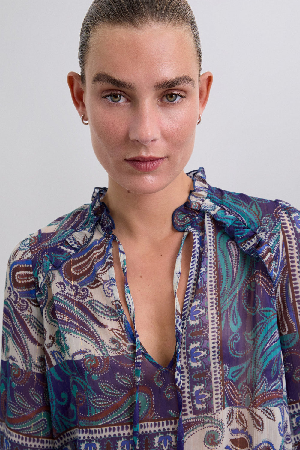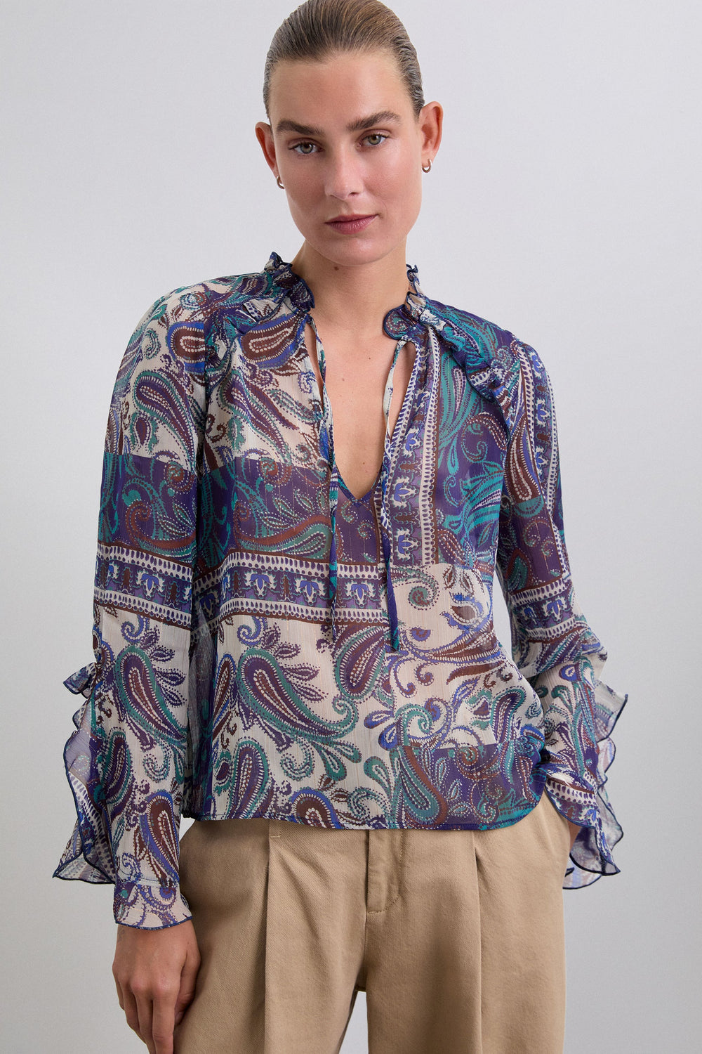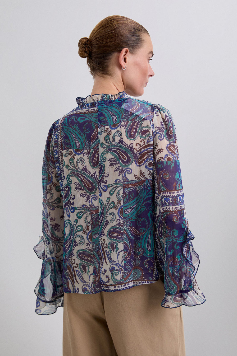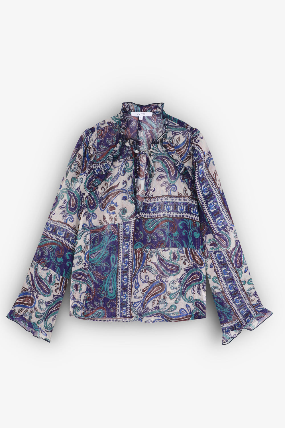Blouse met semitransparante paisleyprint van soepelvallende stof met metallic vezel. Regular fit, hoge kraag met volant en V-hals met lintsluiting. Lange mouw afgewerkt met volant