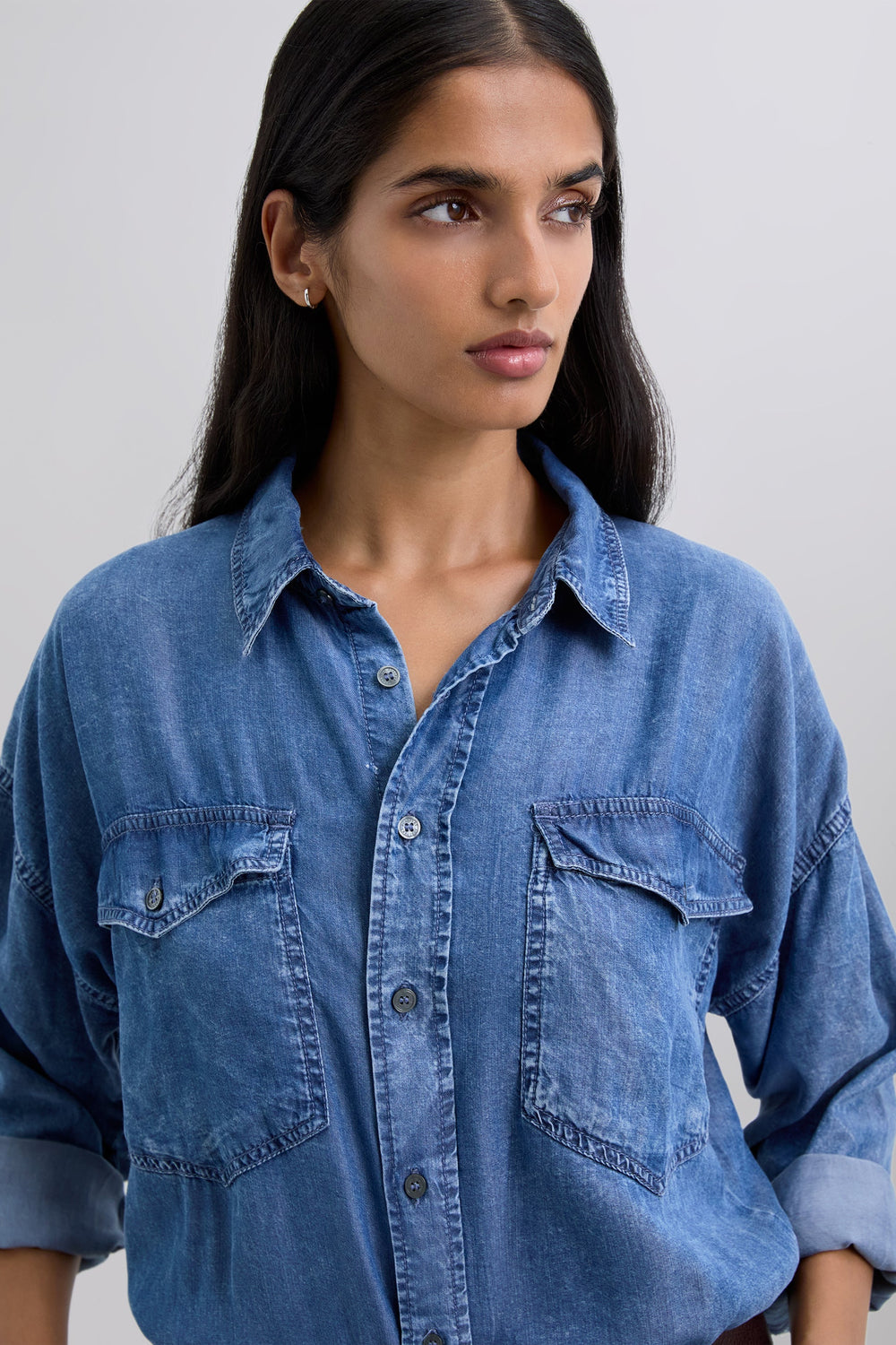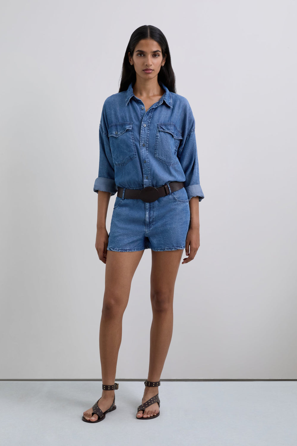 Playsuit in a loose-fitting denim-effect fabric. Shirt collar. Long sleeves. Button fastening. Front and back pockets.