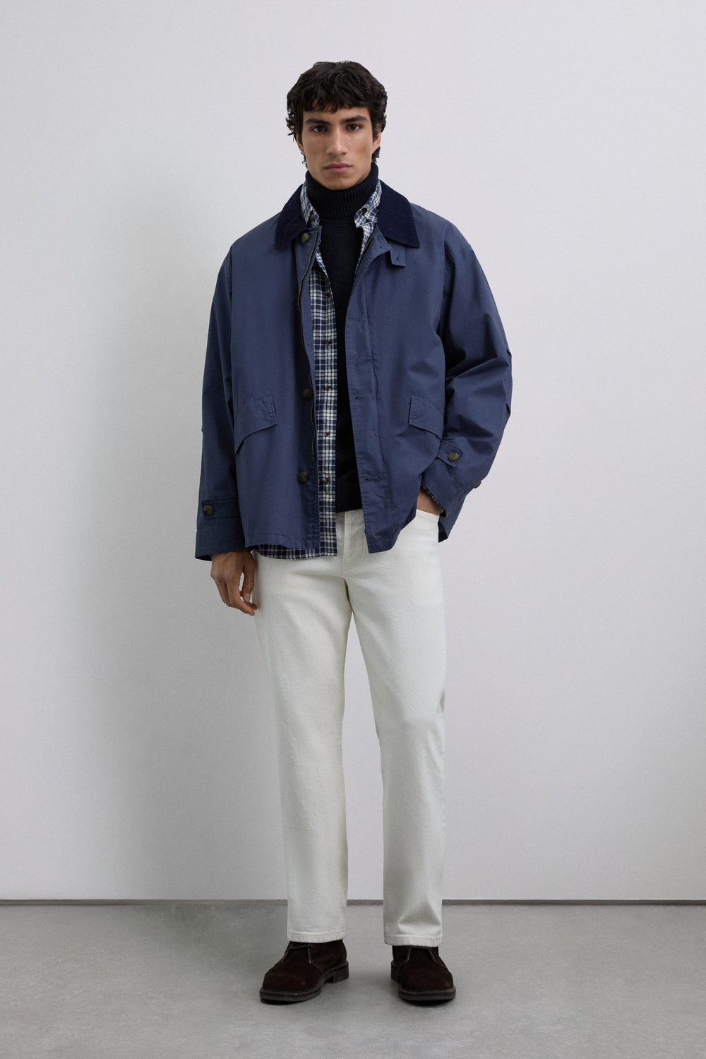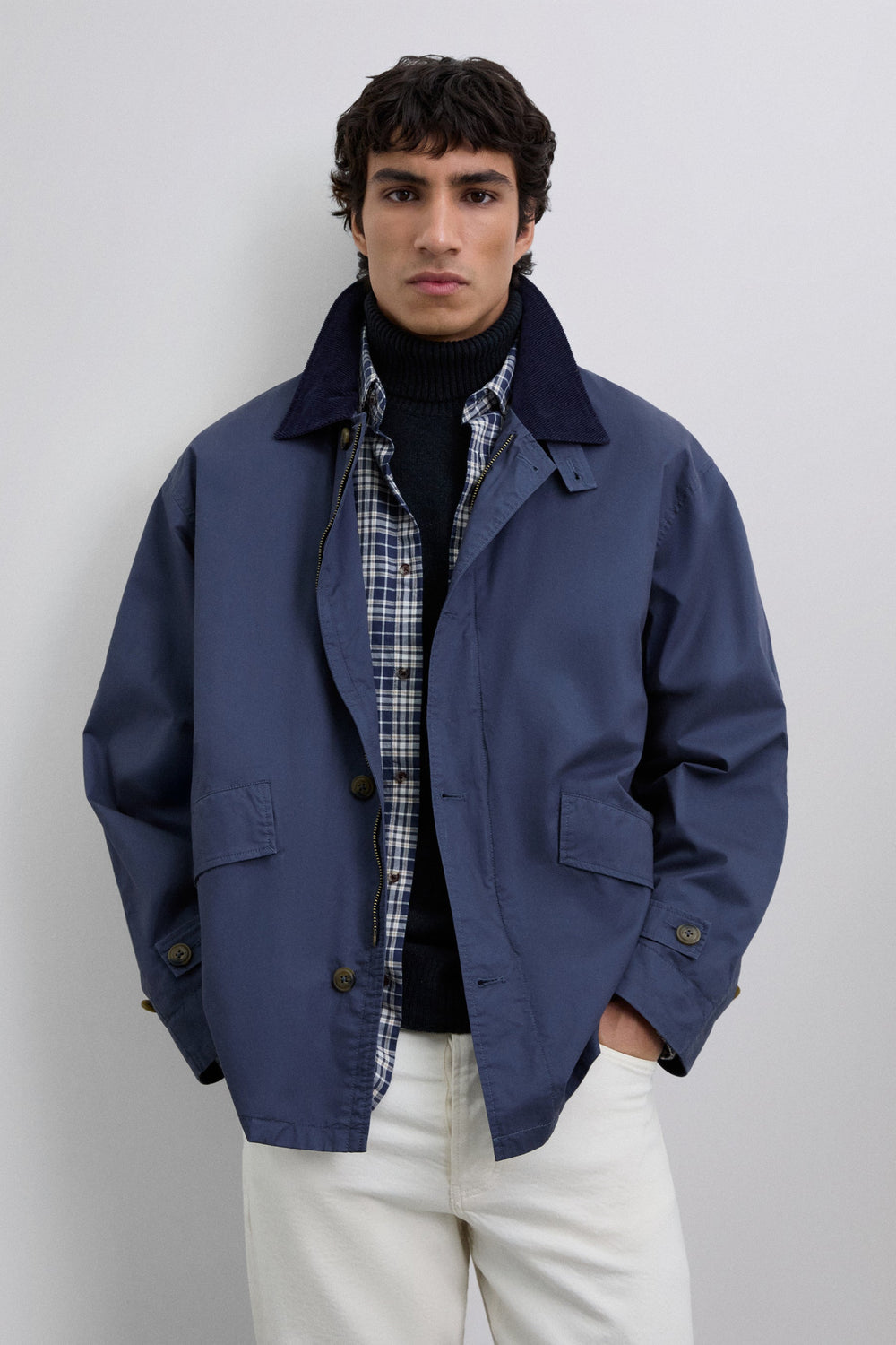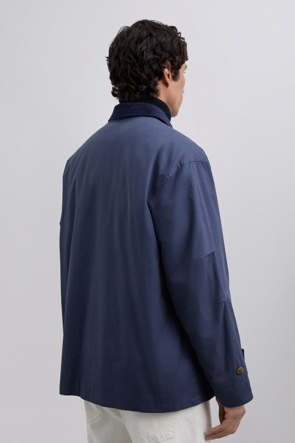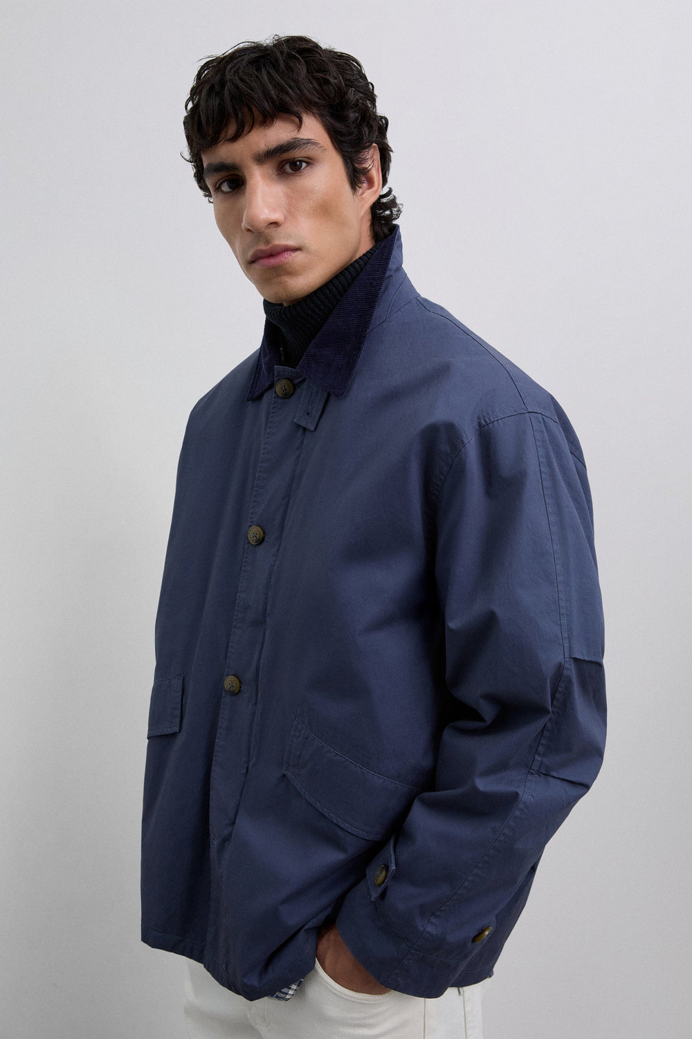 Jacket made of 100% BCI cotton. Front zip and button fastening, both customised. Corduroy shirt collar with buttoned tab. Long sleeves. Corduroy details on sleeve openings. Front slant pockets. Wider cut. Adjustable sleeve tab with double button.