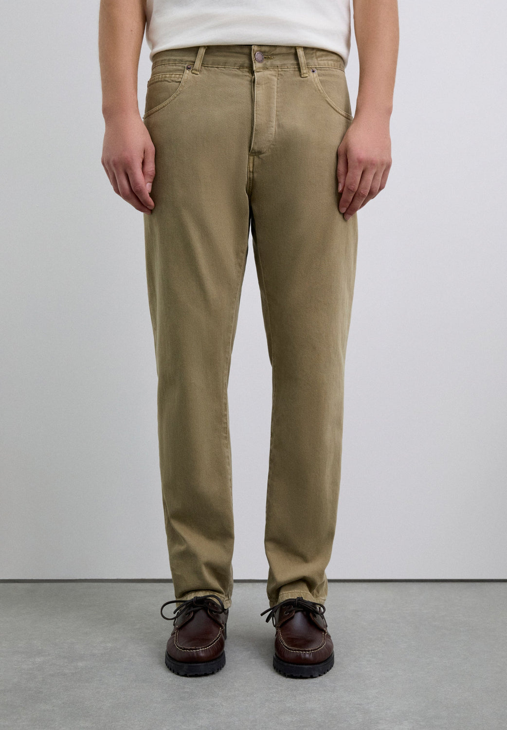 Straight trousers made of 100% cotton. Front and back pockets. Button and zip fastening. Belt loops at the waist. Logo label details on the belt and pocket.