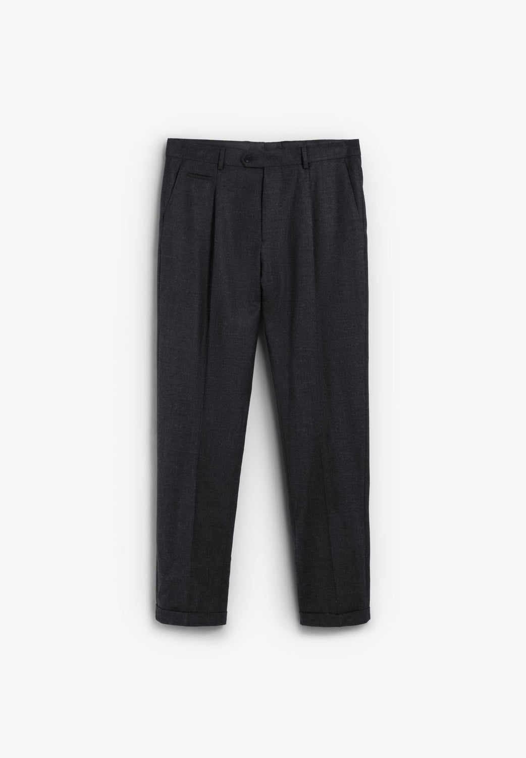 Trousers made of a wool and cotton blend. Front darts. Turn-up hem. Front zip and button fastening. Belt loops at the waist.