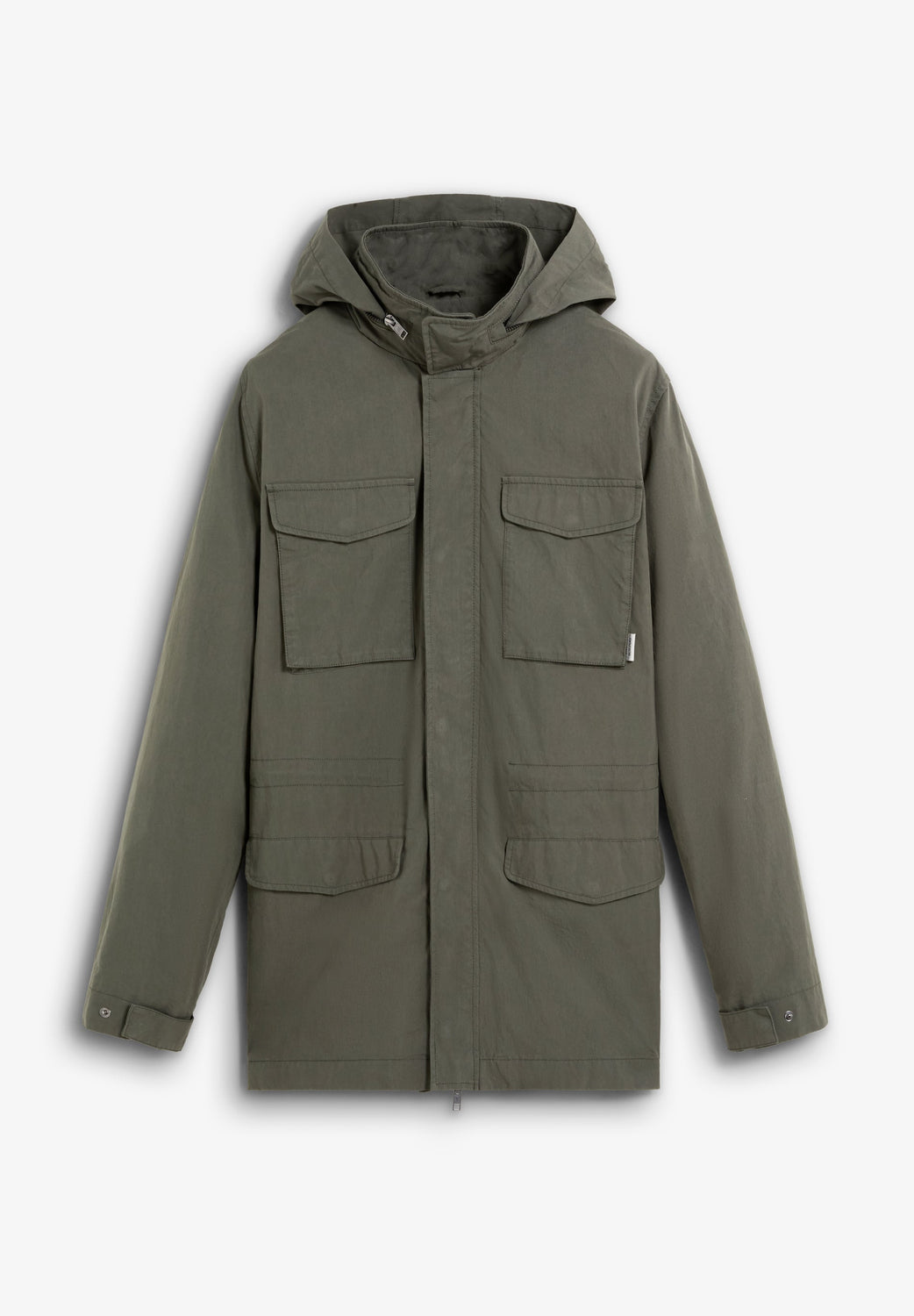 Military-style parka made of BCI cotton. Four front pockets. Neck fastening detail. Inner drawstring adjuster. Front zip fastening. Contrast concealed hood inside the collar. Logo label detail.